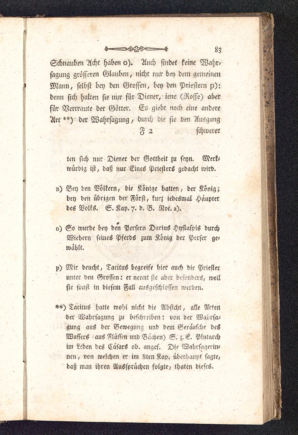 **) Tacitus hatte wohl nicht die Absicht, alle 2Mettder Wahrsagung zu beschreiben: von der Wu-rsa-gimg aus der Bewegung und dem Geräusche desWassers < aus Nüssen und Bachen) S. Z. E. Plutarchim Leben des Cäsars ob. angcf. Die Wahrsagerin^ncn, von welchen er im 8tcn Kap. übecl-aupt sagte,daß man ihren AuSsprüchcn folgte/ thaten dieses.