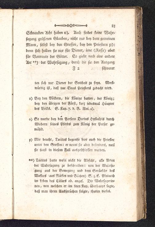 Schnauben Acht haben o). Auch fiudet keine Wahr-sagung grösseren Glauben, nicht nur bey dem gemeinenMann, selbst bey den Grossen, bey den Priestern p):denn sich halten sie ni^r für Diener, jene (Rosse) aberfür Vertraute der Götter. Es giebt noch eine andereArt **)' der Wahrsagung, durch die sie den Ausgang