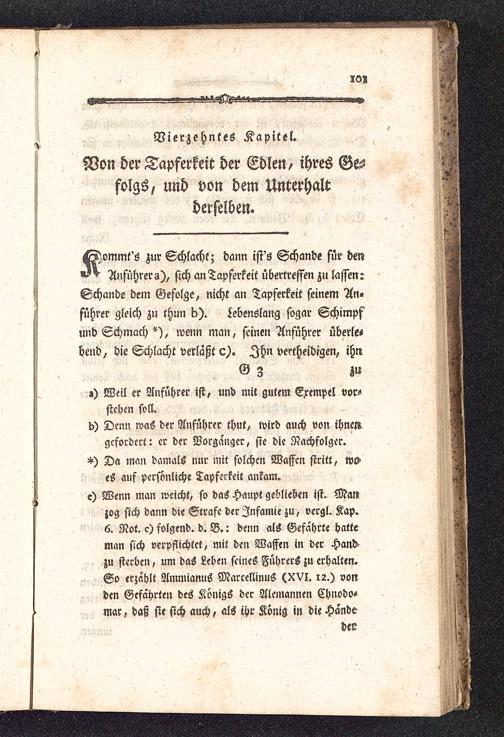 c) Wenn man weicht, so das Haupt geblieben ist. Mai»zog sich dann die Strafe der Infamie zu, vergl. Kap.6. Not. c) folgend, d. B.: denn als Gefährte hatteman sich verpflichtet, mit den Waffen in der Handzu sterben, um das Leben seines Führers zu erhalten.So erzahlt Ammianus MareellinuS (XVI. 12.) vonden Gefährten des Köings der Alemannen Chnodo«mar, daß sie sich auch, als ihr König in die Hände