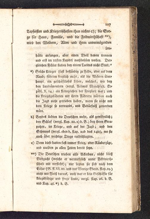 **) Die Deutschen trieben also Ackerbau, nicht bloßViehzucht (welche er vermuthlich unter Feldwirth»schaft mit versteht); nur legten sie sieb nach demCäsar (G. K.VI.22. und nur Wenige Ebend. Ktfp.29.)nicht mit Fleiß darauf, auch war er kein Geschaffte fürkriegsfahige und freye Leute, vergl. Kap. 26. d< H,und Kap. 45. *) d. B.
