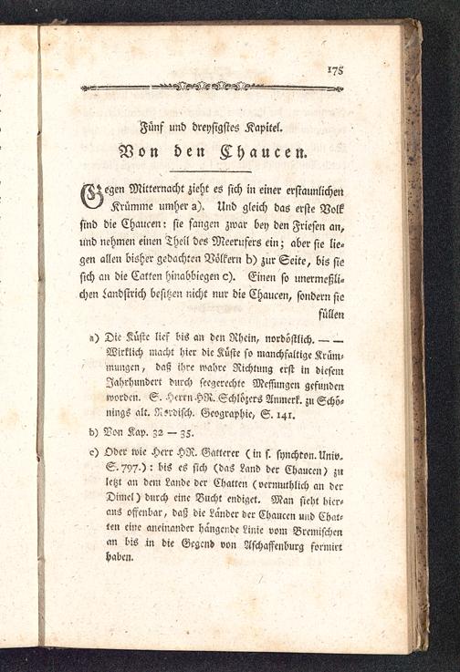 c) Oder wie Herr HR. Satterer (in s. synchron. Univ,S. 797-)' bis es sich (das Land der Chaueei,) zuletzt an dem Lande der Chatten (vermuthlich an derDimel) durch eine Bucht endiget. Man sieht hier-ans offenbar, daß die Lander der Chancen u»d Chat-ten eine aneii^ander bangende Linie vom Bremische,,an bis in die Gcg-nd von Aschaffenburg formirthaben.