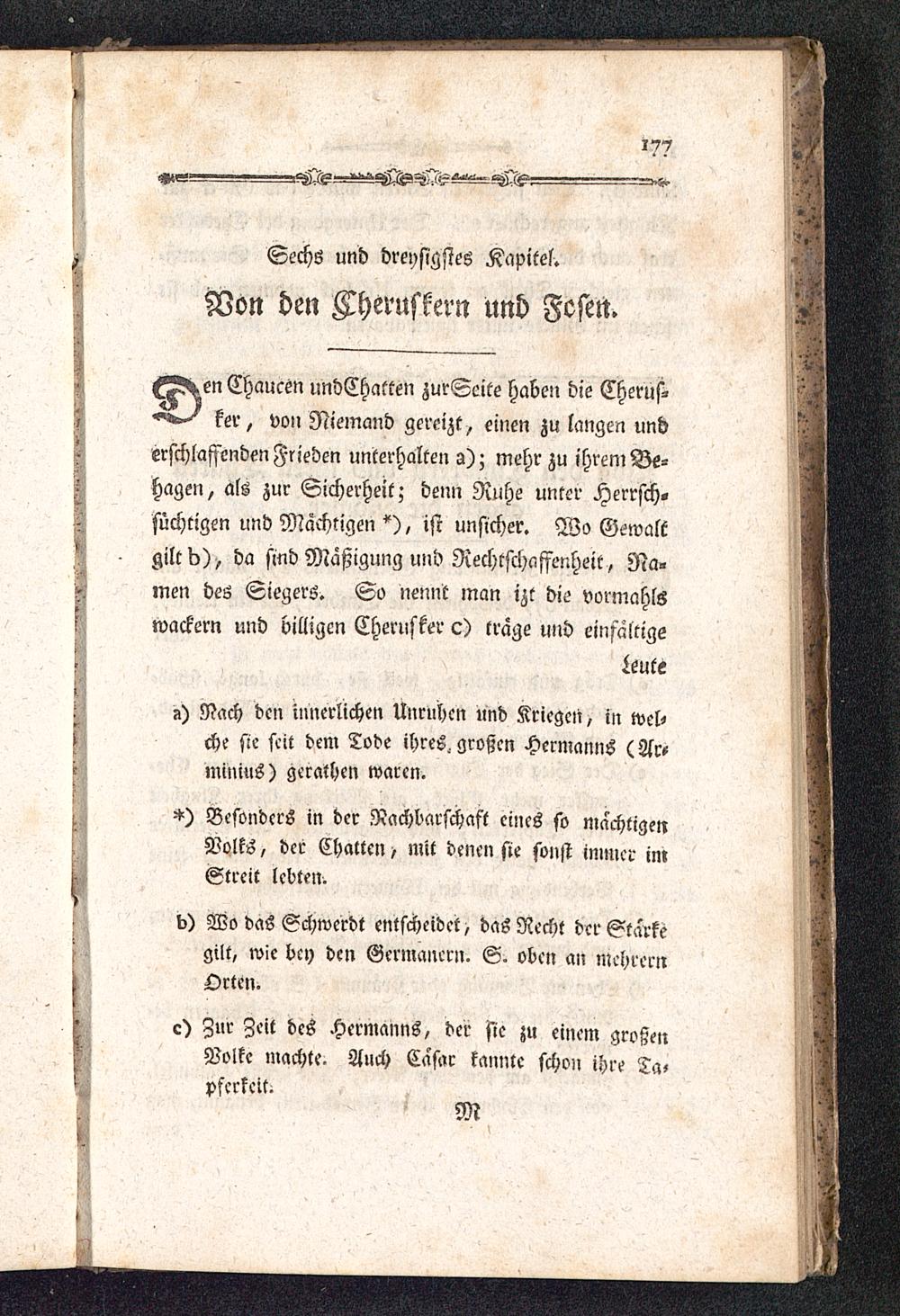 €<py n Chaucen undChatten zurSeite haben die Cherüs-ker, vo» Niemaich gereizt, einen zu langen underschlaffenden Frieden unterhalten a); mehr zu ihrem Be-Hagen, als zur Sicherheit; denn Ruhe unter Herrsch«süchtigen und Mächtigen *), ist unsicher. Wo Gewaltgilt b), da sind Mäßigung und Rechtschaffenheit , Na»men des Siegers. So nennt man izt die vormahlswackern und billigen Cherlisker c) trage und einfältige