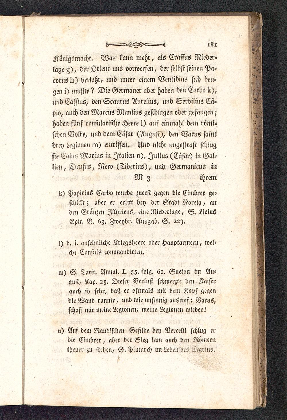 m) S. Tacit. Annal. I. 55. folg. 61. Sueton im Au-gust, Kap. 2Z. Dieser Verlust schmerzt? den Kaiserauch so sehr, daß er oftmals mit dem Kopf gegendie Wand rannte, und wie unsinnig ausrief: Varus ^schaff mir meine Legionen, meine Legionen wieder!