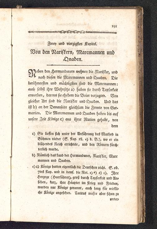 ^^eben den Hermundurern wohnen die Narisker, undnach diesen die Marcmannen und O.uaden. Dieberühmtesten und mächtigsten sind die Marcmannen:auch selbst ihre Wohnsitze a) haben sie durch Tapserkeiterworben, daraus sie ehedem die Vsier verjagten. Vongleicher Art sind die Narisker und O.uaden. Und dasist b) an der Donauseite gleichsam die Fronte von Ger-manien. Die Marcmannen und O.uaden haben bis ausunsere Zeit Könige c) aus ihrer Nation gehabt, von