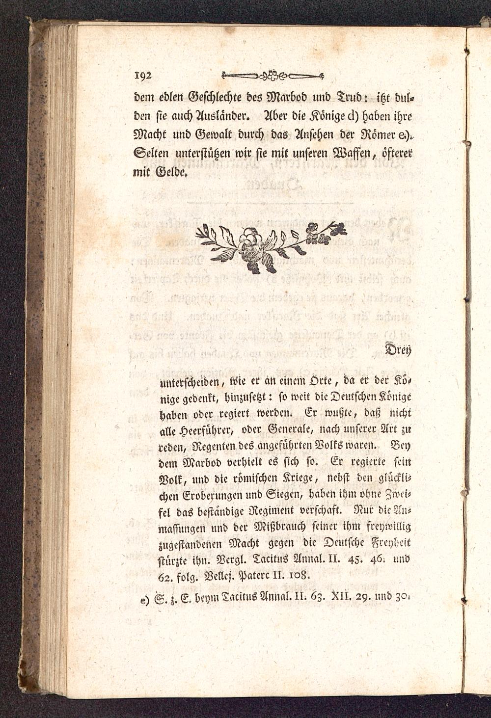 unterscheiden, Mit er an einem Orte, da er der Kö,nigc gedenkt, hinzusetzt: so weit die Deutschen Königehaben oder regiert werden. Er wußte, daß nichtalle Heerführer, oder Generale, nach unserer Art zureden, Regenten des angeführten Volks waren. Beydem Marbod verhielt es sich so. Er regierte seinVolk, und die römischen Kriege, nebst den gläckli-chen Eroberungen und Siegen, haben ihm ohne Zwei-fel das beständige Regiment verschaft. Nur die An--massungen und der Mißbrauch seiner ihm ftty'willigzugestandenen Macht gegen die Dctitsche Freyheitstürzte ihn. Vcrgl. Tacitus Annal. II. 45. 46. und62. folg. Vellcj. Paterc II. 108.