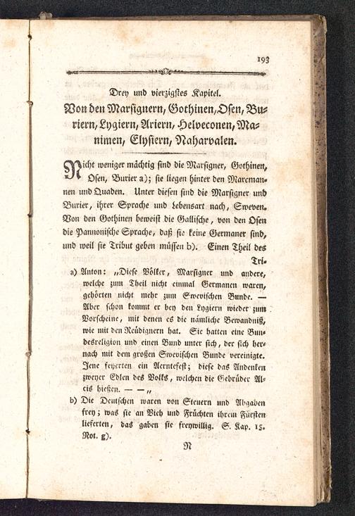 CYVchr weniger mächtig sind die Marsigner, Gothinen,*J+ Ösen, Burier a); sie liegen hinter den Marcman-nen und Quaden. Unter diesen sind die Marsigner undBurier, ihrer Sprache und Lebensart nach, Sweven.Von den Gothinen beweist die Gallische, von den Ösendie Pannonische Sprache, daß sie keine Germaner sind,und weil sie Tribut geben müssen b). Einen Theil des