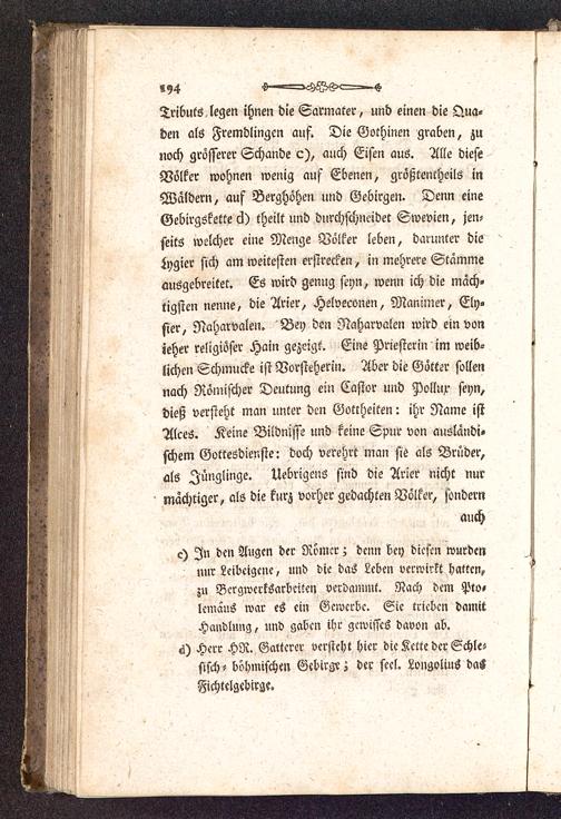 Tributs legen ihnen die Sarmater, und einen die O.ua-den als Fremdlingen auf. Die Gothinen graben, zunoch grösserer Schande c), auch Eisen aus. Alle dieseVölker wohnen wenig aus Ebenen, größtentheils inWäldern, auf Berghöhen und Gebirgen. Denn eineGebirgskette 6) theilt und durchschneidet Swevien, jen>seits welcher eine Menge Völker leben, darunter dieLygier sich am weitesten erstrecken, in mehrere Stammeausgebreitet. Es wird genug seyn, wenn ich die mach-tigsien nenne, die Arier, Helveeonen, Manimer, Ely.sier, Naharvalen. Bey den Naharvalen wird ein vonjeher religiöser Hain gezeigt. Eine Priesterin im weib-lichen Schmucke ist Vorsteherin. Aber die Götter sollennach Röinischer Deutung ein Castor und Pollux seyn,dieß versteht man unter den Gottheiten: ihr Name istAlces. Keine Bildnisse und keine Spur von auslandi«schem Gottesdienste: doch verehrt man sie als Brüder,als Iüi'.glinge. Uebrigens sind die Arier nicht nurmachtiger, als die kurz vorher gedachten Völker, sondern