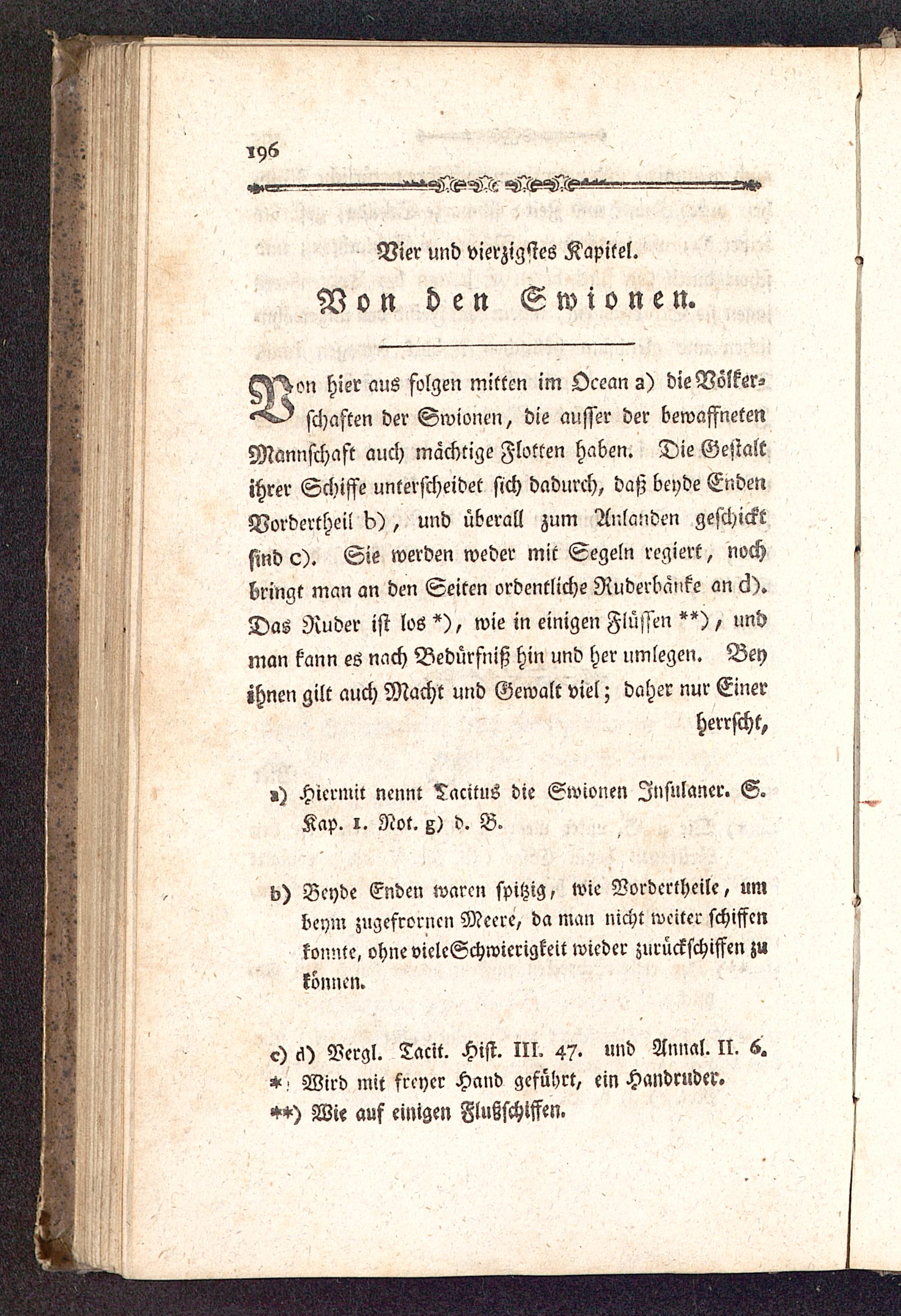 C|*Vn hier aus folgen mitten im Ocean z) die Völker-schaffn der Swionen, die ausser der bewaffnetenMannschaft auch mächtige Flotten haben. Die Gestaltihrer Schiffe unterscheidet sich dadurch, daß beyde EndenVordertheii b), und überall zum Anlanden geschicktfmd c). Sie werden weder mit Segeln regiert, nochbringt man an den Seiten ordentliche Ruderbänke an d).Das Ruder ist los *), wie in einigen Flüffen **)/ undman kann es nach Bedürfniß hin und her umlegen. Beyihnen gilt auch Macht und Gewalt viel; daher nur Einer