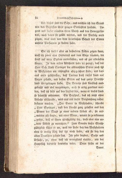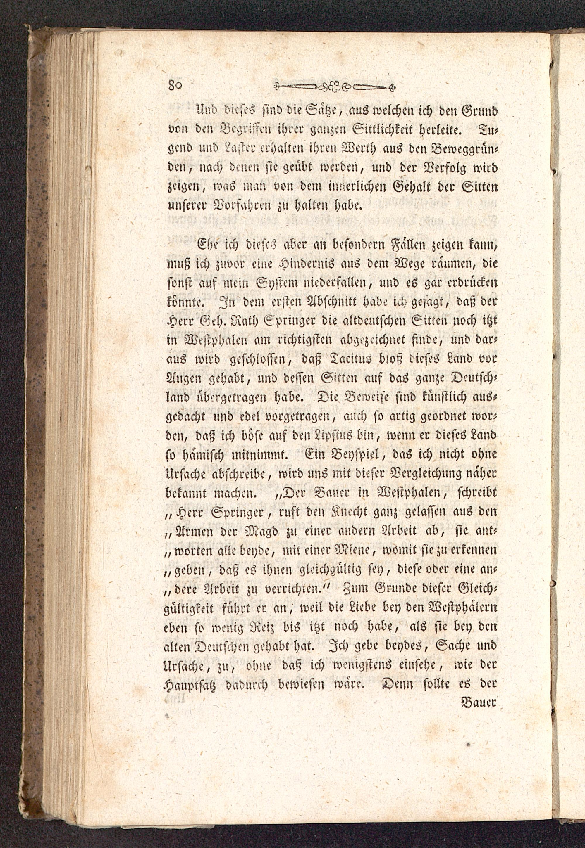 Ehe ich diese? aber an besondern Fallen zeigen kann,muß ich zuvor eine Hindernis aus dem Wege räumen, diesonst auf mein System niederfallen, und es gar erdrückenkönnte. In dein ersten Abschnitt habe ich gesagt, das; derHerr Geh. Rath Springer die altdeutschen Sitten noch itztin Weftphaien am richtigsten abgezeichnet finde, und dar-aus wird geschlossen, daß Tacitus bsoß dieses Land vorAugen gehabt, und dessen Sitten auf das ganze Deutsch«land übergetragen habe. Die Beweise sind künstlich aus-gedacht und edel vorgetragen, auch so artig geordnet wor«den, daß ich böse auf den Lipsius bin, wenn er dieses Landso hämisch mitnimmt. Ein Beyspiel, da6 ich nicht ohneUrsache abschreibe, wird uns mit dieser Vcrgleichuug naherbekannt machen. „Der Bauer in Westphalcn, schreibt„ Herr Springer, ruft den Knecht ganz gelassen aus den„Armen der Magd zu einer andern Arbeit ab, sie ant-„ werten alle beyde, mit einer Miene, womit sie zu erkennen„ geben, daß es ihnen gleichgültig sey, diese oder eine an-„ dere Arbeit zu verrichte;,." Zum Grunde dieser Gleich-gültigcett führ! er an, weil die Liebe bey den Wcstphaicrneben so wenig Reiz bis itzt noch habe, als sie bey denalten Deutschen gehabt hat. Ich gebe beydes, Sache undUrsache, zu, ohne daß ich wenigstens einsehe, ivie derHauptsatz dadurch bewiesen wäre. Denn sollte es der