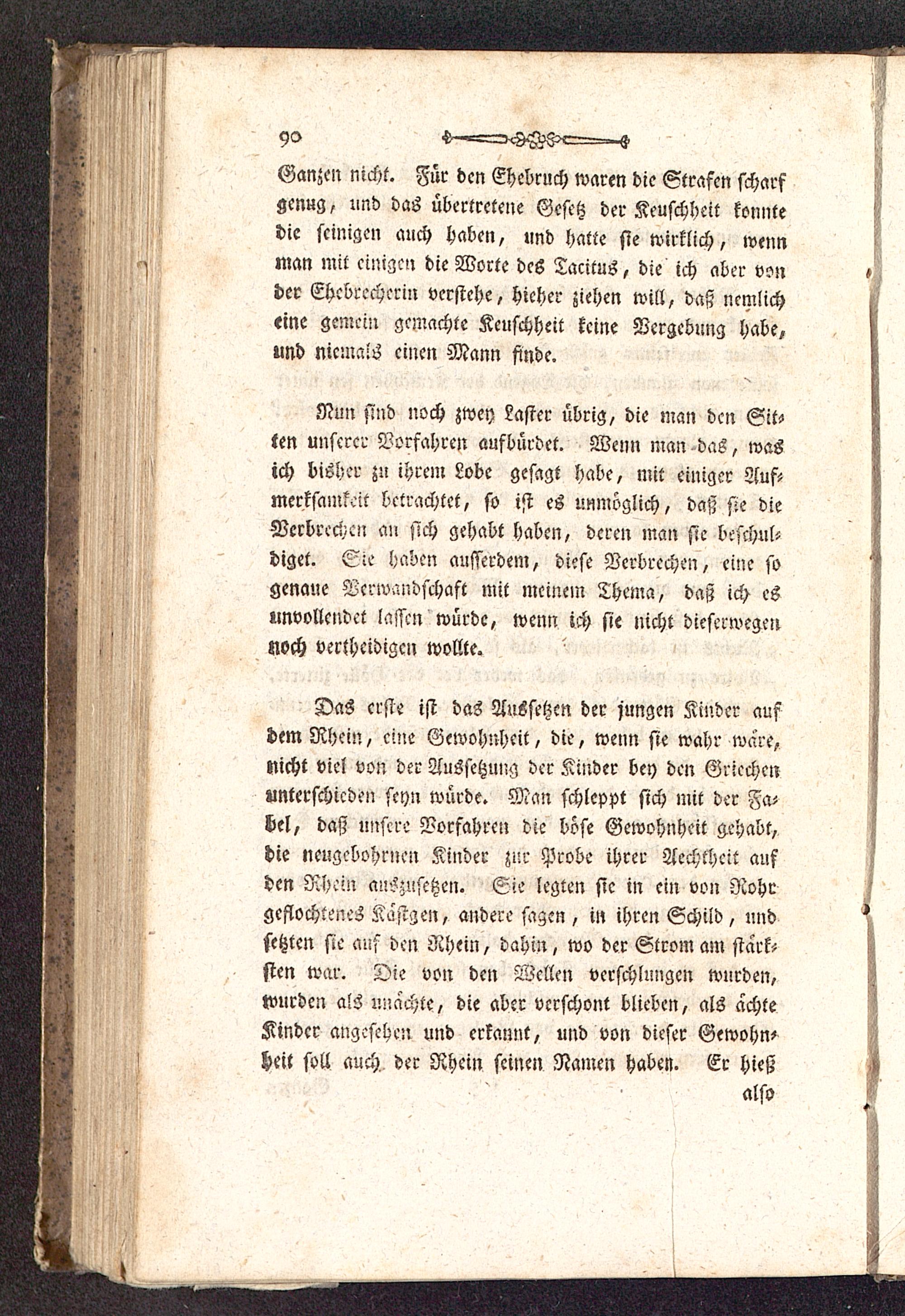 Das erste ist das Aussetzen der jungen Kinder aufdem Rhein , eine Gewohnheit, die, wenn sie wahr wäre,nicht viel von der Aussetzung der Kinder bey den Griechenunterschieden seyn würde. Man schleppt sich mit der Fcubel, daß msscre Vorfahren die böse Gewohnheit gehabt,hie neugcbohrnen Kinder zur Probe ihrer Aechchcit aufden Rhein auszusetzen. Sie legten sie in ein von Rohrgeflochtenes Kastgen, andere sagen , in ihren Schild, undsetzten sie auf den Rhein , dahin, wo der Strom am starbsten war. Die von den Wellen verschlungen wurden,wurden als unachte, die aber verschont blieben, als achteKinder angesehen und erkannt, und von dieser Gewöhneheit soll auch der Rhein seinen Namen haben. Er hieß