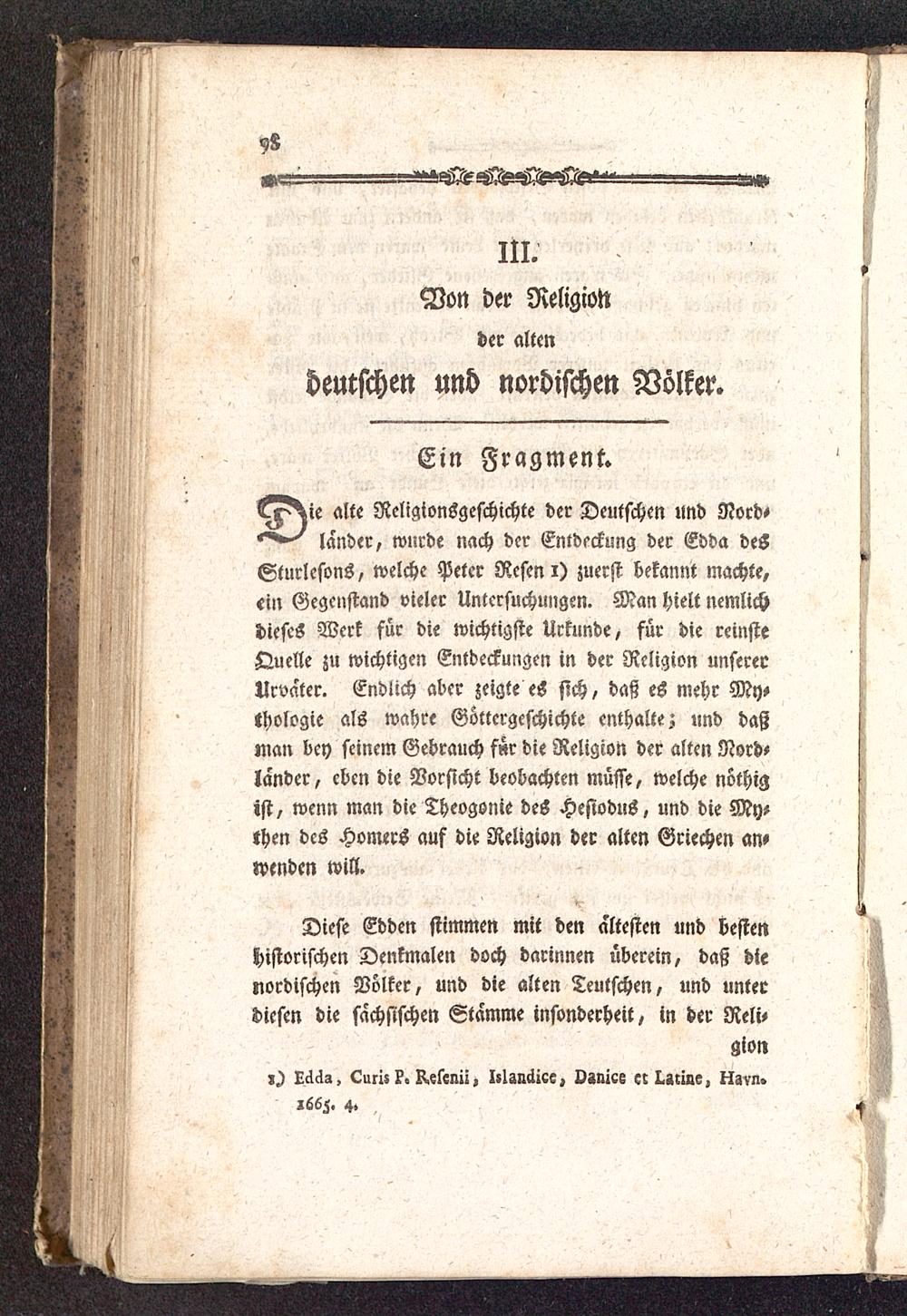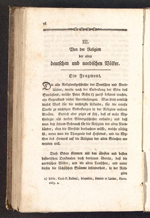 l^^ie alte Religionsgeschichte der Deutschen und Nord^lander, wurde nach der Entdeckung der Edda deSSturlesons, welche Peter Resen i) zuerst bekannt machte,«in Gegenstand vieler Untersuchungen. Man hielt nemlichdieses Werk für die wichtigste Urkunde, für die reinsteQuelle zu wichtigen Entdeckungen in der Religion unsererUrvater. Endlich aber zeigte eS sich, daß es mehr My-thologie als wahre Göttergcschichte enthalte; «nd daßman bey seinem Gebrauch f«r die Religion der alten Nord-lander, eben die Vorsicht beobachten müsse, welche nöthigist, wenn man die Theogonie des Hesiodus, und die My-then des Homers auf die Religion der alten Griechen an-wenden will.