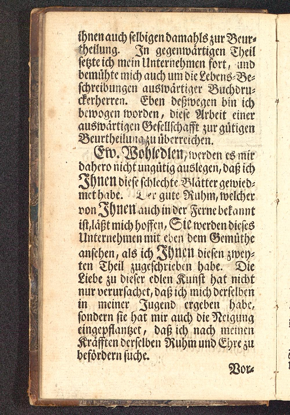 ansehen, als ich JhMN diesen zwey-ten Theil zugcschricbcn habe. DieLiebe zu dieser edlen Kunst hat nichtnur verursachet, daß ich mich derselbenin meiner Jugend ergeben habe,sondern sie hat mir auch die Neigungeingepflanzt, daß ich nach meinenKrassten derselben Ruhm und Ehre zubefördern suche.