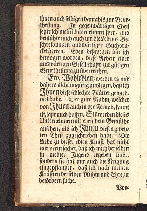 ihnen auch stlbigen damahls zur Bcur-Heilung. In gegenwärtigen Theilsetzte ich mein Unternehmen fort, andbemühte mich auch um die Le!>en6-Be-schrcibungcn auswärtiger Buchdru-ckerherren. Eben deßwegen bin ichbiwogen worden, diese Arbeit einerauswärtigen Gesellschafft zur gütigenBeurtheilung zu überreichen.