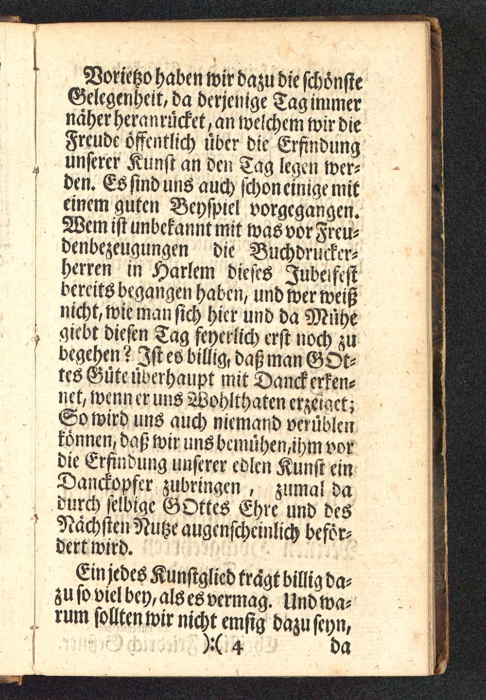 Vorietzo haben wir dazu die schönsteGelegenheit/ da derjenige Tagimmernaher heranrücket, an welchem wir dieFreude öffentlich über die Erfindungunserer Kunst an Den Tag legen wer-den. Es sind un6 auch schon einige miteinem guten Beyspiel vorgegangen.Wem ist unbekannt mit waö vor Freu-denbezeugungen die Buchdrucker-Herren in Harlem dieses Jubelfestbereits begangen haben, und wer weißnicht, wie man sich hier und da Mühef giebt diesen Tag feycrlich erst noch zu, begehen ? Ist eo billig, daß man GOt-tes Güte überhaupt mit Danckerken-net, wenn er uns Wohlthaten erzeiget;So wird uns auch niemand verüble»können, daß wir uns bcmühen,ihm vordie Erfindung unserer edlen Kunst einDanckopfcr zubringen , zumal dadurch selbige GOttes Ehre und des[ Nächsten Nutze augenscheinlich beför-dertwird.