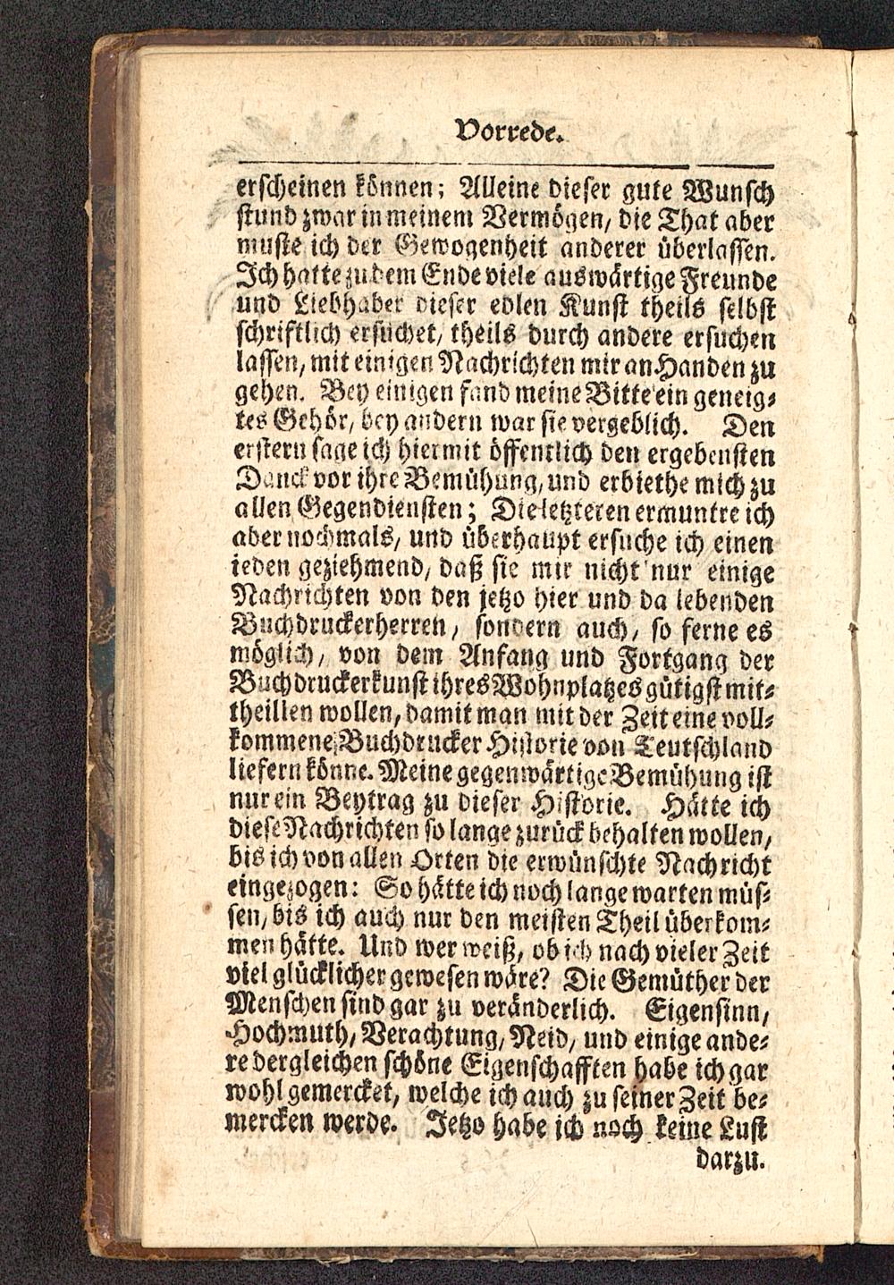 erscheinen können; AUeine dieser gute Wunschstund zwar in meinen» Vermögen/ die That abermufte ich der Gewogenheit anderer überlcisien.Ich hatte zu dem Ende viele auswärtige Freundeund Liebhaber oieftr edlen Kunst thenö selbstschriftlich ersuchet/ theils durch andere ersuchenlassen, mit einigen Nachrichten mir anHanden zugehen. Bey einigen fund meineBitteein geneig-tes Gehör/ bey andern war sie vergeblich. Denerstern sage ich hiermit öffentlich den ergebenstenD.uick vor ihre Bemühung, und erbiethe mich zuallen Gegendiensten; Die letzteren ermuntre ichaber Normals/ und überhaupt ersnche ich einenjeden geziehmend/daß sie nur nicht nur einigeNachrichten von den jetzo hier und da lebendenBuchdruckerherren / sonoern auch/ so ferne esmöglich/ von dem Anfang und Fortgang derBuchdruckerkunstihresWohtiplatzesgütigstmit-theilten wollen, damit man milder Zeit eine voll-kommene^Buchdrucker Historie von Teutschlandliefern könne. Meine gegenwartigeBemühung istnur ein Beytrag zu dieser Historie. Hätte ichdieftNachrichten so lanae zurück behalten wollen,bis ich von allen Orten die erwünschte Nachrichteingezogen: So hätte ich noch lange warten müstsen/bis ich auch nur den meisten Theil überkom-menhätte. Und werwciß, vbi'hnachvielerZeitviel glücklicher gewesen wäre? Die Gemüther derMenschen sind gar zu veränderlich. Eigensinn/Hochmuth, Verachtung, Neid, und einige ande-redergleichen schöne Eigenschafften habe ich garwohl gemercket, welche ich auch zu seinerzeit be-mercken werde. Ietzo habe jch nach keine Lust