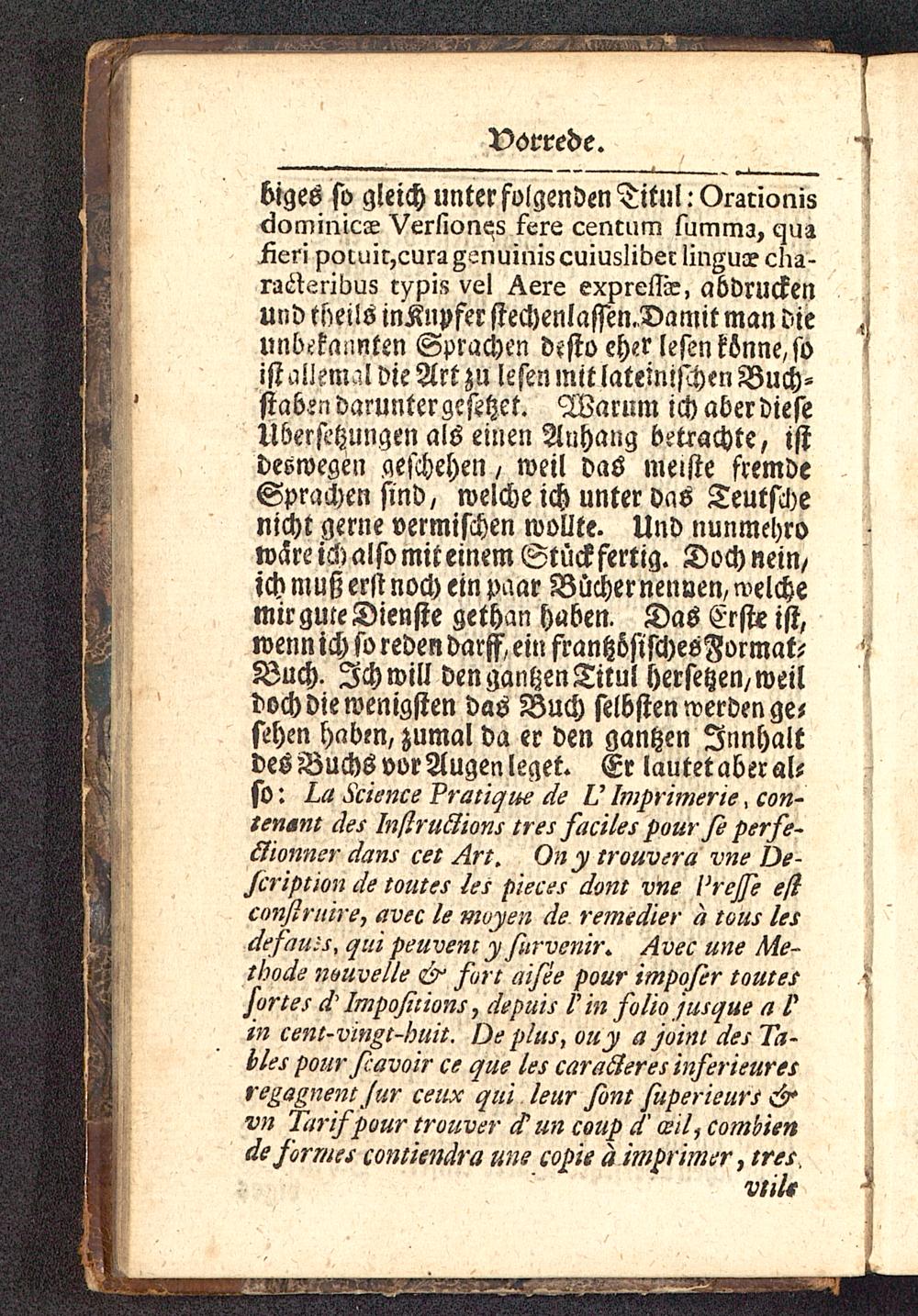biges so gleich unter folgenden TitulOrarionisdominicae Versiones fere centum summa, quaüeri potuir,cura genuinis cuiuslibec linguae cha-racteribus typis vel Aere expreffie, abdruckenundtl)eilsinKnpftrstechenlassen.Damitmandieunbekannten Sprachen desto eher lesen könne, soist ^Üemal die Art zu lesen mit lateinijHen Buch-stab^ii darunter gefttzet. Warum ich aber dieseÜbersetzungen als einen Anhang bettachte, istdeswegen qeiHehen / weil das meiste fremdeSprachen sind/ welche ich unter b^s Teutschenicht gerne vermischen wollte. Und nunmchrowäre ich also mit einem Stückfertig. Doch nein,ich muß erst noch ein paar Bücher nennen, welchemir gute Dienste gethan haben. Das Erste ist,wenn ich so reden darff, ein frantzöstschesFormat-Buch. Ich will den gantzen Titui hersetzen/weildoch die wenigsten das Buch selbsten werden ge-sehen haben, zumal da er den gantzen Jnnhaltdes Buchs vorAugen leget. Er lautetaberal-so: La Science Pratique de U hnprimerie , con-tenant des Inflruäions tres faciles pour fe perfe-clionner dans cet Art. Ony trouvera vne De-Jcription de toutes /es pieces dont vne Vreffe eficonflritire, avec le muyen de remedier a tous lesdefmics, qui peuvent y furvenir* Avec une Me-thode nmvelle & fort aifie pour impofer toutesfort es d Impofiüons , depuis l'in so Ho jusque a Vin cent-vingt-huit. De plus, ouy a joim des Ta-bles pourfiavoir ce que les caraäeres inferieuresregagnent Jur ceux qui leur fönt fuperieurs &vn Tarif pour trouver dun coup d' <eit t combiendeformes contiendra une copie a imprimer, tres.