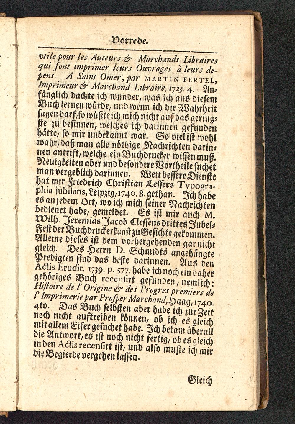 vtile pour /es Auteurs & Marchands Librairesqui sont imprinier leurs Ouvrages a leurs de-pens. A Saint Ottier,par martin fertel,Imprimeur & Marchand Libraire, 1723. 4. An-fänglich dachte ich wunder, was ich ans diesemBuch lernen würbe, und wenn ich die Wahrheitsagen darf/so wüßteich mich nicht aufvas gering-ste zu besinnen, welches ich vannnen gefundenhätte- so mir unbekannt war. So viel ist wohlwahr, daß man alle nöthige Nachrichten darin-nen antrjft/welche ein Buchdrucker wissen muß.Neuigkeiten aber und besondere Vottheile suchetman vergeblich darinnen. Weit bessere Dienstehat mir Friedrich Christian Messers Typogn-phia jubilans, Leipzig/174 °- 8, gethan. Ich habee6 an jedem Ort/ wo ich mich feiner Nachrichtenbedienet habe/ gemeldet. Es ist mir auch M.Will). Ieremias'Iacob Clessens drittes Jubel-Fest der Buchdruckerkunst zuGesichte gekommen.Alleine dieses ist dem vorhergehenden garnichtgleich. Des Herrn D. Schmidts angehängtePredigten sind das beste darinnen. Aus denActis iimdit. 1739- p- 577. habe ich noch ein dahergehöriges Buch recensnt gefunden/ nemlich:Htfioire de /' Origine & des Progres premiers des Imprimerie par Pro/perMarchnnd,S^a^, 1740.4to. Das Buch selbsten aber habe ich zur Zeitnoch nicht auftreiben können/ ob ich es gleichmitallem Eifer gefuchet habe. Ich bekam überalldie Antwort/es lst noch nicht fertig/ ob esaieichin den Actisrecensirt ist/ und also musie ich mirdie Begierde vergehen lassen.