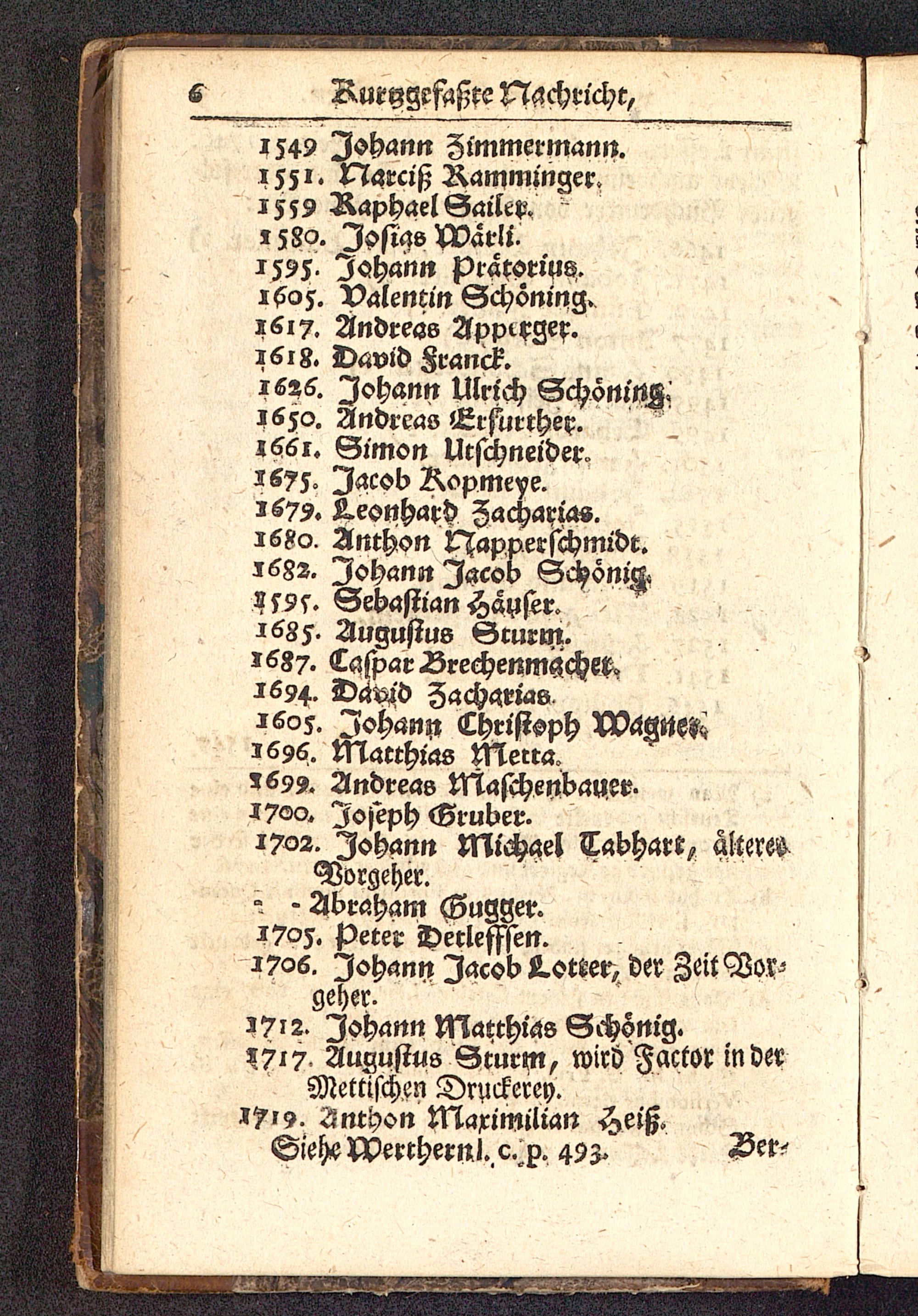 1549 Jshann Zimmermantt.1551. ZTlarciß Ramminger.1559 RaphaelSailex.»58o. Ip^as VOatli.^595 Johann ptat-ows,i6oy. Valentin Schöning.-617. Andreas AppcpZer.-618. David Franck.16S6. Johann Ulrkch SchottiNZ.^16$o. Andreas iLrfuechep.i66r. Simon Utschneider°Jacob Ropmeye.