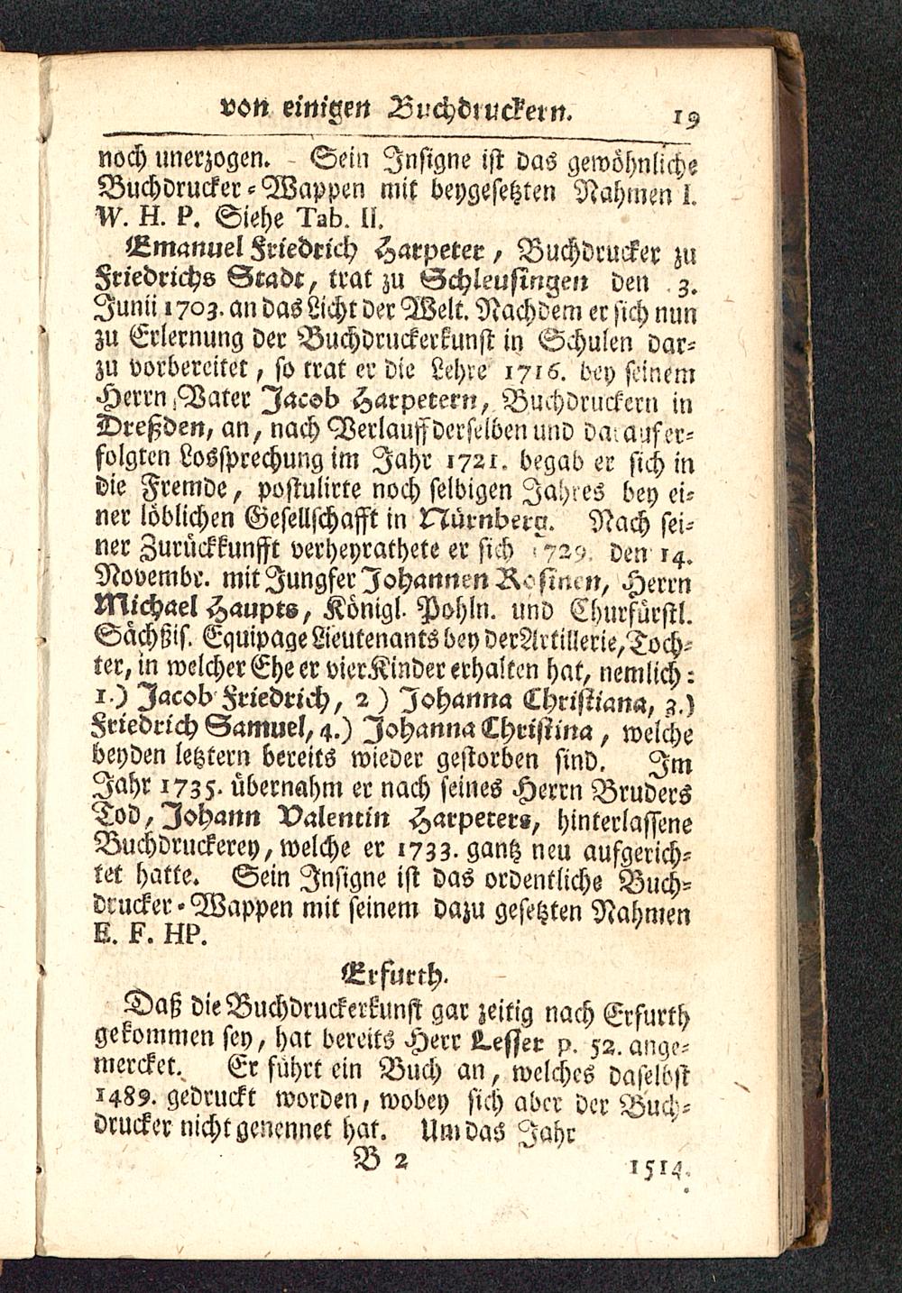 lLmanuel Friedrich Haepeter, Buchdrucker zuFriedrichs Gmdc, trat zu Gchleusingett den z.Junii 170z. an das Licht der Welt. Nachdem er sich nunzu Erlernung der Buchdruckerkunst in Schulen dar-zu vorbereitet, so trat er die Lchre 1716. bey seinemHerrn jVater Jacob Harperern, Buchdruckern inDreßden, an, nach Verlauf derftiben und da^aufer-folgten Lossprechung im Jahr 1721. begab er sich indie Fremde, postulirte noch selbigen Jahres bey ei-ner löblichen Gesellschafft in Nürnbero. Nach sei-wr Zurückkunfft verheyrathete er sich ^729. den r 4 .Novembc. mit Jungfer Johannen Ro sittc», HerrnMichael Haupts, Königl^ Pohln. und Churfürstl.Sacchßis. Equipage Lieutenants bey VerArtiIlerie,Toch-ter, in welcher Ehe er vierKinder erhalten hat, nemlich:1) Jacob Friedrich, 2 ) Johanna Lhristiana, ?.)Friedrich Samuel, 4.) Johanna Lhristina, welchebeyden letztern bereits wieder gestorben sind. ImJahr 1735. übernahm er nach seines Herrn BrudersTod, Johann Valentin Harpecer«, hinterlasseneBuchdruckerey, welche er 1733. gantz neu aufgerich-tet hatte. Sein Jnsigne ist das ordentliche Buch-Drucker-Wappen mit seinem dazu gesetzten NahmenE. F. HP.