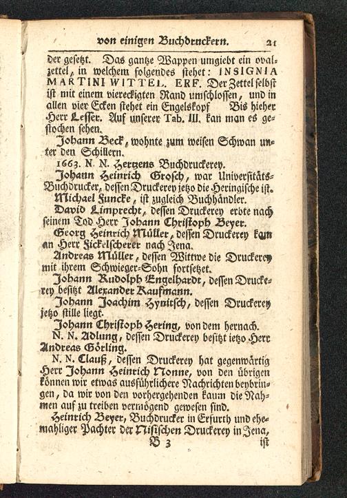 N. N. Clauß, dessen Druckerey hat gegenwartig^err Johann Heinrich ttonne, von den übrigenkönnen wir etwas ausführlichere Nachrichten beybrin-gen, da wir von den vorhergehenden kaum die Nah-men auf zu treiben vermögend gewesen sind.