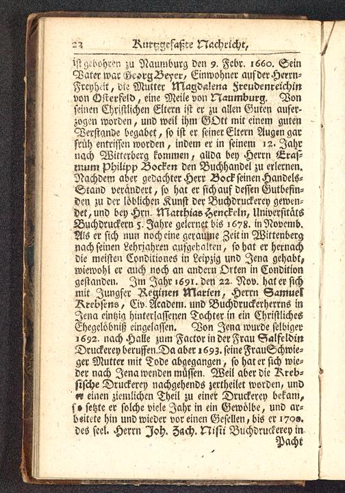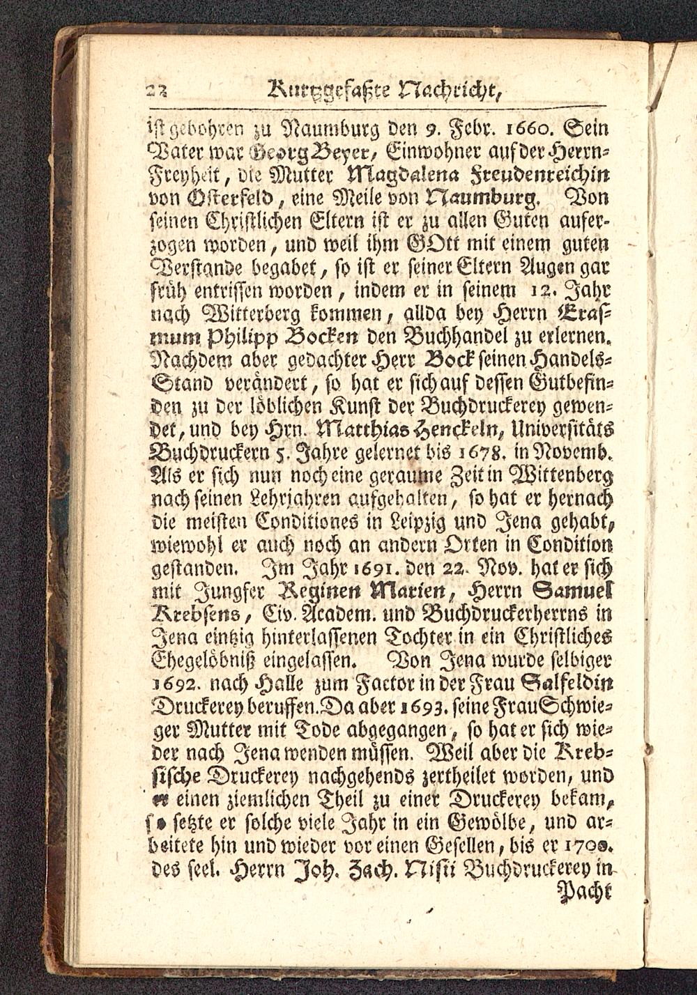 ist gcbohr-'n zu Naumburg dm 9. Febr. 1660. SemVater war GcsrgBeyer/ Einwohner aufderHerrn-Freyheit, vls Mutter tNagdsiena ^'reudeneeichmvon Gn erfeld, eine Meile von Naumburg. Vonseinen Christlichen Eltern ist er zu allen Guten aufer-zogen worden, und weil ihm GOtt mit einem gutenVerstände begäbet, so ist er seiner Eltern Augsn garfrüh entrissen worden, indem er in seinem 12. Jahrnach Witterberg kommen, allda bey Herrn Eraffmum Philipp Äocken den Buchhandel zu erlernen.Nachdem aber gedachter Herr Sock seinen Handels-Stand verändert, so har er sich auf dessen Gutbefin-Den zu der löblichen Kunst der Buchdruckerey gewen-yet,und bey Hrn. Matthias Hmek«. ln, UniversitatsBuchdruckern 5. Jahre gelernst bis 1678. in Novemh.Ais er sich nun noch eine geraume Zeit in Wittenberg nach seinen Lehrjahren aufgehalten, so hat er hernachdie meisten Conditiones in Leipzig und Jena gehabt,wiewohl er auch noch an andern Orten in Conditio»gestanden. Im Jahr ,691. den 22. Nov. hat er sichmit Jungfer Reamett Marien, Herrn Gamuet"Atwfens , Civ, Academ. und Buchdruckerherrns inJena emtzig hinkerlassenen Tochter in ein ChristlichesEhegelöbnis? eingelassen. Von Jena wurde selbigerj 692. nach Halle zum Factor in der Frau GalfeldmDruckereyberuffen.Da aber 1693. seine FrauSchwie-ger Mutter mit Tode abgegangen, so hat er sich wie-der nach Jena wenden müssen. Weil aber die Rreb-fische Druckerey nachgehends zertheilet worden, und' m einen ziemlichen Theil zu einer Druckerey bekam,s» setzte er solche viele Jahr in ein Gewölbe, und ar-bettete hin und wieder vor einen Gesellen, bis er 170s.des ftel. Herrn Ioh. Zach. Hifii Buchdruckerey in-Pacht