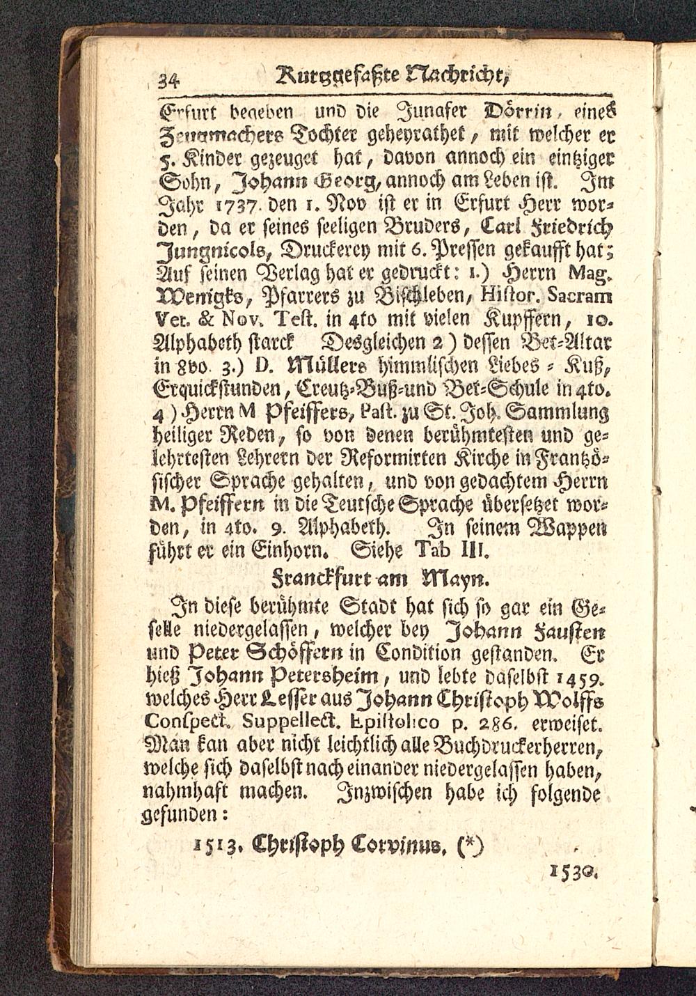 Hrfurt deaeben und vie Junafer Dörruz« cineSZ -.mm^cher? Tschter geheyrathet, mit welcher er5. Kinder gezeugct hat, davon annoch em emtzigerSobn, lobarni Georg, annoch am Leben ist. ImJahr -TZ? den 1. Nov ist er in Erfurt Herr wor-den , da er seines seeligen Bruders, <Lar! FriedrichIuttgm'cols, Druckerei) mit 6. Pressen gekaufft hat?Auf seinen Verlag hat er gedruckt: 1.) Herrn Mag.VOem'gks, Pfarrers zu Bifchleben/ Hiftor. SacramVor. & Nov. Test, in 4to mit vielen Kupffern, 10.Alphabeth starck Desgleichen 2 ) dessen Bet-Altarjn 8vi>. z.) !). Müllers himmlischen Liebes - Kuß,Erquickstunden, Ereutz-Buß-und Bek-Schule in 4to.4 ) Herrn M Pfeiffers, fall zu St. Joh. Sammlungheiliger Reden , so von denen berühmtesten und ge-lehrtesten Lehrern der Reformirten Kirche mFrantzö--sischer Sprache gehalten, und von gedachtem HerrnM. pfeiffan in die Teutsche Sprache übersetzet wor--den, in 4to. 9. Alphabeth. Jn seinem Wappenführt er ein Einhorn. Siehe Tab IIl.