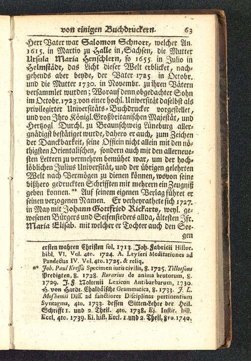 Herr Vater war Galomon Schnorr, welcher An./615. in Martio zu Halle in,Sachsen, die MutterUrsula Maria Henschlern, so 1655 in Julio inHelmstadt, vas Acht dieser Welt erblicket, nach-gehends aber beyde, der Vater 1725 in Octobr. und die Mutter 1730. in Novembr. zu ihren Väternversammlet wurden; Woranfdmn^obgedachter Sohnim Octobr. 172 z.von einer hochl. Universität daselbst alsprivilegirter Umversitats- Buchdrucker vorgestellet,und von Jhro Königl.Großbriranischen Majestät, undHerkogl Durchl. zu Braunschweig Lüneburg aller-gnädigst bestätiget wurde,dahero er auch, zum Zeichender Danckbarreit, seine Officin nicht allein mit den nö-thigsten Orientalischen, sondern auch mit den allerneue-sten Lettern zu vermehren bemühet war, um der hoch,löblichen Julius Universität, und der übrigen gelehrtenWelt nach Vermögen zu dienen können, wovon seinebißhero gedruckten Schafften mit mehrern ein Zeugnißgeben können.** Auf seinem eigenen Verlag führet erseinen verzogenen Namen. Er verheyrathete sich 1727.in May mit Johann Gottfried Ric^arts, weyl. ge-wefenen Bürgers und Selfensieders allda, ältesten Jfr.Maria Llisab. mit welcher er Tochter auch den See-___ gen