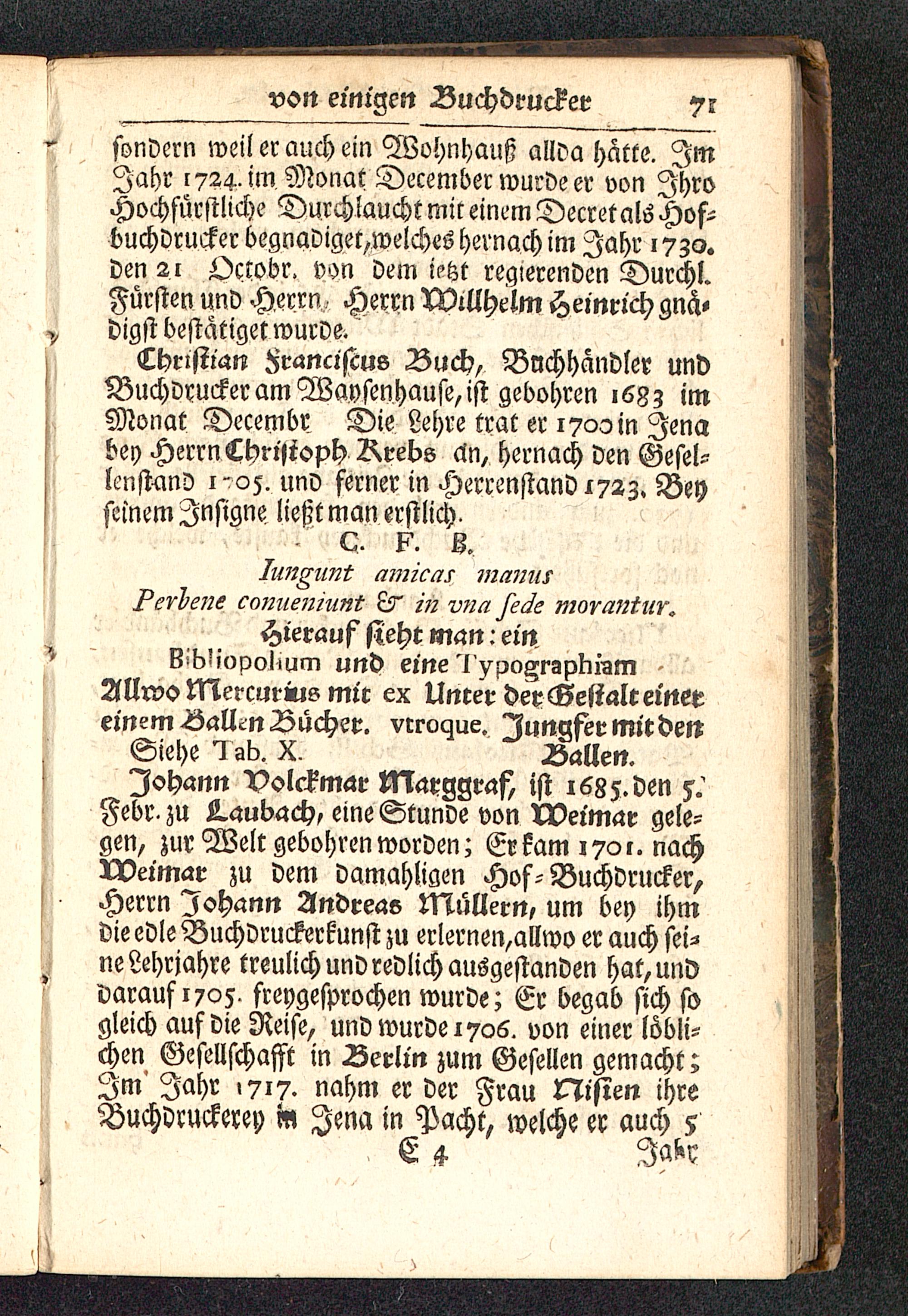 Johann Volckmar Marggraf, ist 1685. den 5.'Febr. zu 5.aubach, eine Stunde von Weimar gele-gen, zur Welt gebohren worden; Er kam 1701. nachZlVeimar zu dem damahligen Hof-Buchdrucker,Herrn Johann Andreas Müllern, um bey ihmdie edle Buchdruckerkunst zu erlernen,allwo er auch sei--ne Lehrjahre treulich und redlich ausgestanden hat, unddarauf 1705- freygesprochen wurde; Er begab sich sogleich auf die Reise, und wurde 1706. von einer löbli-chen Gesellschafft in Berlin zum Gesellen gemacht;Im' Jahr ,717. nahm er der Frau triften ihreBuchvruckerey 'm Jena in Pacht, welche er auch 5