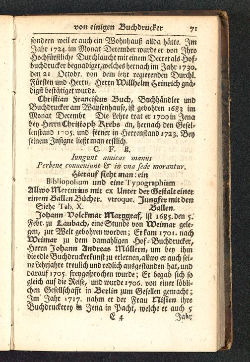 Christian $tancifcm Buch, Bachhandler undBuchvrucker am Waysenhause, ist gebohren 168 z imMonat Decembr Die Lehre trat er 1700 in Jenabey Herrn Christoph Rrebs an, hernach den Gesel-lenst<lnd 1-05. und ferner in Herrenstand 172z. Beyseinem Jnsigne ließt man erstlich.
