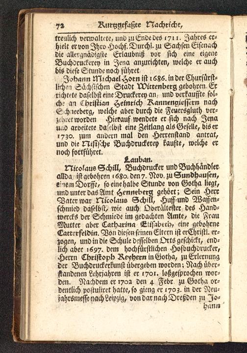 Nicolaue Schill, Buchdrucker und BuchhändlerGilda ist yebohren > 680. den?. Nov. zu Sundhttustn,einem Dorffe, so eine halbe Stunde von Gotha liegt,und unter das Amt Hennel?erg gehört; Sein HerrVater war Nicolaus Sch-ll, Huff-und Waffen-schmied daftlbst, wie auch Oderaltester des Hand-wercks der Schmiede im gedachten Amte, die FrauÄwtter aber Lacharina QZUfabub, eine gebohrneCatterfetdin. Von diese»ftinen Eltern ist erChristl. er-zogen, und in die Schule desselben Orts geschickt, end-lich aber ,697. dem hochfürstlichen Hofbuchdrucker,Herrn ChristopK Reyhern in Gotha , zu Erlernungder Buchdruckerkunst übergeben worden; Nach über-standenen Lehrjahren ist er 1701. loßgesprochen wor-den. Nachdem er 1702 den 4 Febr zu Gotha or-dentlich poftuliret hatte,so gieng er 170z. in der Neu-zahrömesse nach Leipzig , von dar nach Dreßden zu Is-