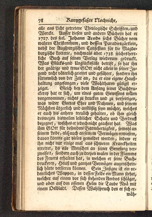 alle ans Licht getretene Theologische Schrifften/undWercke. Ausser diesen und andern Büchern hat er1727. des seel. Johann 2lrnd« sechs Bücher vomwahren Christenthum/ und desien Paradiesgärtlein,nebst der Augspurgischen Confeßion für die Magde-burgische Lotterie, nachmals aber 1738. solches herr-liche Buch auf seinen Verlag wiederum gedruckt.Was Glücks-und Unglücksfälle betrift, so hat ihnder gnadige und treue GOtt nicht allein in seiner fu-gend recht väterlich geleitet und geführet, sondern ihnfürnemlich von der Zeit an, da er eine eigene Hauß-Haltung angefangen, viele Wohlthaten gütigst er-zeiget. Gleich bey dem Anfang seiner Buchd?u-ckerey hat er sich, um eines guten Gewissens willenvorgenommen, nichts zu drucken und zu verfertigen,was wider Gottes Ehre und Nahmen, und seinemNächsten ärgerlich und anstößig seyn möchte, welcheser auch bis anhero treulich gehalten, ob ihm gleichdeswegen bisweilen leiblicher Schade und Verdrußbegegnet, welches er jedoch nicht geachtet hat. Wasihm GOtt für besonders Barmhertzigkeit, sowohl anseinem Leibe, alsZ auch an seinem Vermögen erwiesem,davon könnte gar vieles gemeldet werden, indem erihn nicht nur einige mal aus schweren Kranckheitenerrettet, da alle Menschen an seiner Genesung ver-zweifelt, sondern auch zu dreyen malen in der Flammedes Feuers erhalten hat, in welchen er seine Buch-druckerey, Hauß und gantzes Vermögen augenschein-lich hätte verlieren können. Sein^Jnsigne ist ein or-dmkliches Wappen, in dessen Felde ein Mann stehet,welcher auf einem vor sich stehenden Ambos schlägst,und oben auf den offenen Helm die Taube Noä miteinem Oelbladt. Dessen Wahlspruch den er sich er-