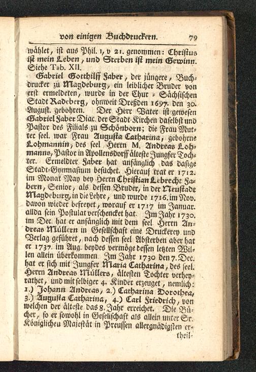 IStadt Radcberg, ohnweit Dreßden 1697. den 30.August, gebohren. Der Herr Vater ist gewesenGabriel 8aber Diac^ der Stadt Kirchen daselbst undPastor detf Filials zu Gchönborn; die Frau Mut-ter seel. war Frau Zlugusta «Lacharina, gebohrne5.ohmannin, des seel Herrn M Andreas L.oh-manne, Pastor in Apollensdorffalteste Jungfer Toch-ter. Ermeldter 8«ber hat anfänglich das dasigeStadt-Gymnasium besuchet. Hierauf trat er 17-2.im Monat May bey »)errn Christian gebrecht Fa-' bern, Senior, als dessen Bruder, in der NeustadtMagdeburg, in die Lehre, und wurde 1716. im Nov.davon wieder befreyet, worauf er 1717 im Januar,allda sein Postulat verschencket hat. Im Jahr 1730.im Dec. hat er anfanglich Mit dem seel Herrn Au-dreas MulUm in Gesellschaft eine Druckerey undVerlag geführet, nach dessen seel Absterben aber hater 1737. im Aug. beydes vermöge dessen letzten Wil-len allein überkommen Im Jahr 1730 den 7.Dec.hat er sich mit Jungfer Maria Cacharina, des seel.Herrn Andreas Müllers, ältesten Tochter verhey-rathet, und mit selbiger 4. Kinder erzeuget, nemlich:1.) Johann Andreas^ 2.) Cacharina Dorothea,3.) Augutia Cacharina, 4.) Carl Friedrich, vonwelchen der älteste das 8. Jahr erreichet. Dis Bü-cher, so er sowohl in Gesellschaft als allein unter Sr.Königlicheu Majestät in Preussen alleranädigsten er-theil-