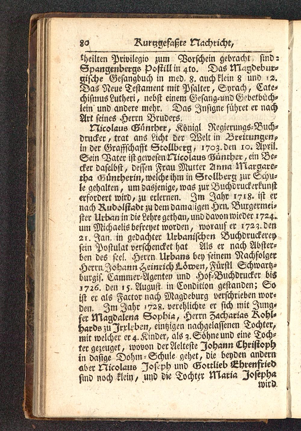 tXicolam Gnnrher, Königl Regierungö-Buch-drucker, trat ans Licht der Welt in Breicungen,in der Graffschafft Grollbcrg, 1703. den io. April.Sein Vater ist gewesen Hicolaus Büncher, ein Be-cker daselbst, dessen Frau Mutter 2lnna Margare-cha «üncherm, welche ihm in Grollberg zur Schu-le gehalten, um dasjenige, was zur Buchdruckerkunsterfordert wird, zu erlernen. Zm Jahr 1718. ist ernach Rudolstade zu dem damaligen Hrn. Bürgermei-ster Urtxm in die Lehre gethan, und davon wieder 1724*um Michaelis befreyet worden, worauf er 172?. den2r.Jali. in gedachter Urbamschen Buchdruckereysein Postulat verschencket hat Als er nach Abster-ben des fiel. Herrn Urdans bey seinem NachfolgerHerrn Johann Heinrich Ä.örven, Fürst! Schwartz-burgis/Cammer-Agenten und Hof-Buchdruckcr bis-726. den ,5. August in Condition gestanden: Soist er als Factor nach Magdeburg verschrieben wor-den. Im Jahr -728. verehlichre er sich mit Jung-fer Magdalena Sophia, Herrn Z<,char:as Z^ohl-hards zu Irx^bLN, eintzigen nachgelassenen Tochter,mit welcher er 4. Kinder, als ?.Söhne und eine Toch-ter gezeuget, wovon der Aelteste Iohann Christophin dasige Dohm- Schule gehet, Die beyden andernaber Nicowus lojlph lind Gorrlieb Lhrenfriedsind noch klein, und die Tochter Maria Iosepha