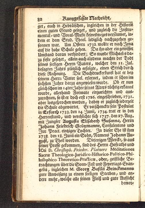 get7 auch in Hebräischen, ingleichen in Der Historieeinen guren Grunv geleget, und zugleich Die Instru-mental, und Vocal-Music keineswegesversaumet, in-dem er dem Stud. Theol. lediglich nachzugehen ge-sonnen war. Um Ostern 1732 wollte er nach Jenaauf die hohe Schule gehen. Da ihn aber ein gewisserUmstand daran verhindert; So wurde Michaelis da-zu feste gesetzet , allein auch aisdenn machte der Todtseines seeligen Herrn Vaters, welcher den 11. Jul.besagten Jahrs plötzlich erfolgte , einen Strich durchdiese Rechnung. Die Buchdruckerkunst hat er beyseinem Herrn Vater seel. erlernet, indem er schon imsechsten Jahre darzu angewiesen wurde. Ob er nungleich schon im l4tenJahre sem!s Alters tüchtig erkanntwurde, allerhand Formate einzurichten und aus-zurechnen, so ist er doch erst 1726. eingeschrieben, 1731.aber losgesprochen worden, dabey er zugleich jederzeitdie Schule abgewartet. Er verschenckte sein Postulatm Erfttrch t7ZZ.den 14 Junii, 1734. trat er in denHerrenstand, und verehlichte sich 1737. den 27. Aug.mit Jungfer Augusta iLlisaberh Susanna, HerrnJohann Friedrich Gcüymanns,Consulentens undZur Pract. eintzigen Tochter. In dieser Ehe ist ihmz738 den 18. Junii ein Sohn, Namens Johann Au-tzust, zu Theil worden. Diejenigen Wercke, so ausseiner Presse gekommen, sind des Herrn HofrathsundICti ü, Chnßopb. Frieder. Platners MfeditationesSacrae Theologico-Juridico-Historico-Politico-Phi-losophico Theoretico-Prastic», oder, geistliche Be-trachtungen über die Sonn-Fest und Feyertags-Evan-gelia, ingleichen M. Georg Äafiln Ärinckmannsgure Anweisung zu einem seeligen Sterben, und an-dere mehr/welche alle seinen Fleiß und gute Aufsicht