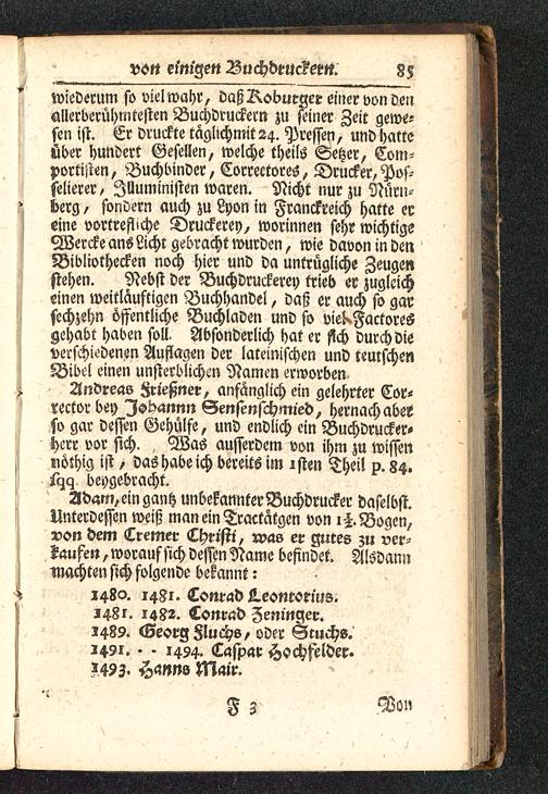 wiederum so vielwahr, daßR.obuegex eitter von deilallerberühmtesten Buchdruckern zu seiner Zeit gewe-sen ist. Er druckte täglichmit24. Pressen, und hatteüber hundert Gesellen, welche theils Setzer, Com-portisten, Buchbinder, Correctores, Drucker, Pos-selierer, JUumimsten waren. Nicht nur zu Nürn-berg , sondern auch zu Lyon in Franckreich hatte ereine vortrefllche Druckerey, worinnen sehr wichtigeWercke ans Licht gebracht wurden, wie davon in denBibliothecken noch hier und da untrügliche Zeugenstehen. Nebst der Buchdruckern) trieb er zugleicheinen weitlauftigen Buchhandel, daß er auch so garsechzehn öffentliche Buchladen und so viel>FactoreSgehabt haben soll. Absonderlich hat er sich durch dieverschiedenen Auflagen der lateinischen und teutschenBibel einen unsterblichen Namen erworben.