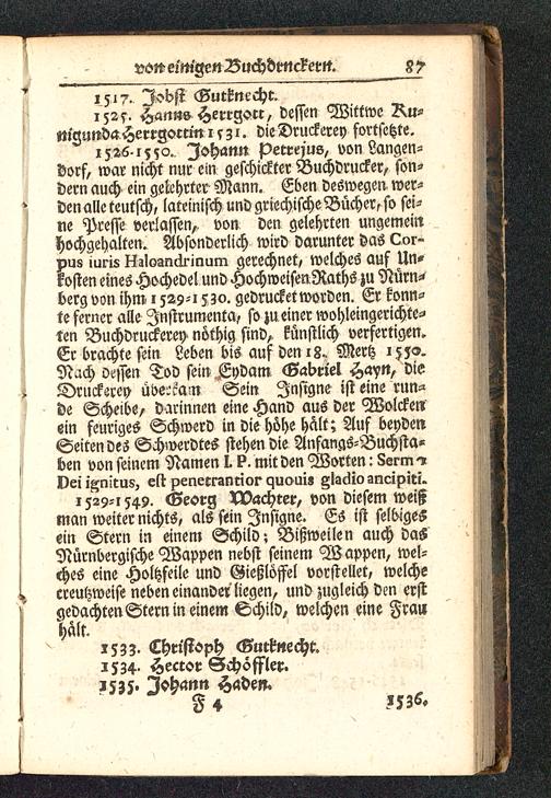 1526-1550*. IshalM petrejus, von Langen-Vorf, war nicht nur ein geschickter Buchdrucker, son-dern auch ein getehrter Mann. Eben deswegen wer-den alle teutsch, lateinisch und griechische Bücher, so sei-ne Presse verlassen^ von den gelehrten ungemeinhochgehalten. Absonderlich wird'darunter das Cor-pus iuris Haloandrinurn gerechnet, welches auf Un-kosten eines Hochedel und Hochweisen Raths zu Nürn-^berg von ihm 1529-15 30. gedrucket worden. Er konn-te ferner alle Instrument«, so ju einer wohleingerichte-ten Buchdruckerey nöthig sind, künstlich verfertigen.Er brachte sein Leben bis auf den 18- Mertz 1550.Nach Dessen Tod sein.Eydam Gabriel Hayn, dieDruckerey üveckam Sein Jnsigne ist eine run-de Scheibe/ darinnen eine Hand aus der Wolckenein feuriges Schwerd in die höhe hält; Auf beydenSeitendes Sch'verdtes stehen die Anfangs-Buchsta--ben von seinem Namen I. ?. milden Worten: Sernr*Dei ignitus, est penetranrior quouis gladio ancipiti.