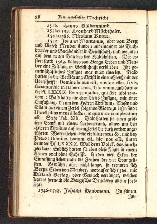 Überschrift: Uornine bonum eft, noshic elfe; fi vis,faciamushic triatabernaeuia, Tibi vnum.und darun-ter ?5. l XXXIX Beatus ; opulus, qui feit lubiiat^o-nem ; Bald hatten sie eben dieses Jnsigne, mit einerEmfaßung, da um den HErrn Christum, Mosen undEliam auf einem Zettel folgende Worte zu lesen sind:H'.ceh filius meiisdilectus, inquom^h complacitumes*. Siehe Tab. Xlll. Bald hatten sie einen grös-fern Creyß mit einem Lorbeercrantz, allwo um den-HErrn Christum auf einemZettel die kurtz vorher ange-führten Worte stehen: Hie est filius raeus &■.. und bey^>ecrs: Domine, bonum est, bic nos esse, Untendrunter Ps. LX XXIX. Wol dem Volck, das/auch-$mtatt: Endlich hatten sie eben diese Figur in einemkleinen oval ohne Schrifft. An den vier Ecken derEinfassung siehet man die Zeichen der vier Evangeli-sten. Es währte aber nicht lange, so trennten sichBergs Erben von Neuber, worauf er sich 1566. mitDietrich Serlay, oder 65er>ach vereiniget, welcherletztere hernach die Äergische Druckerey alleine fort-setzte.