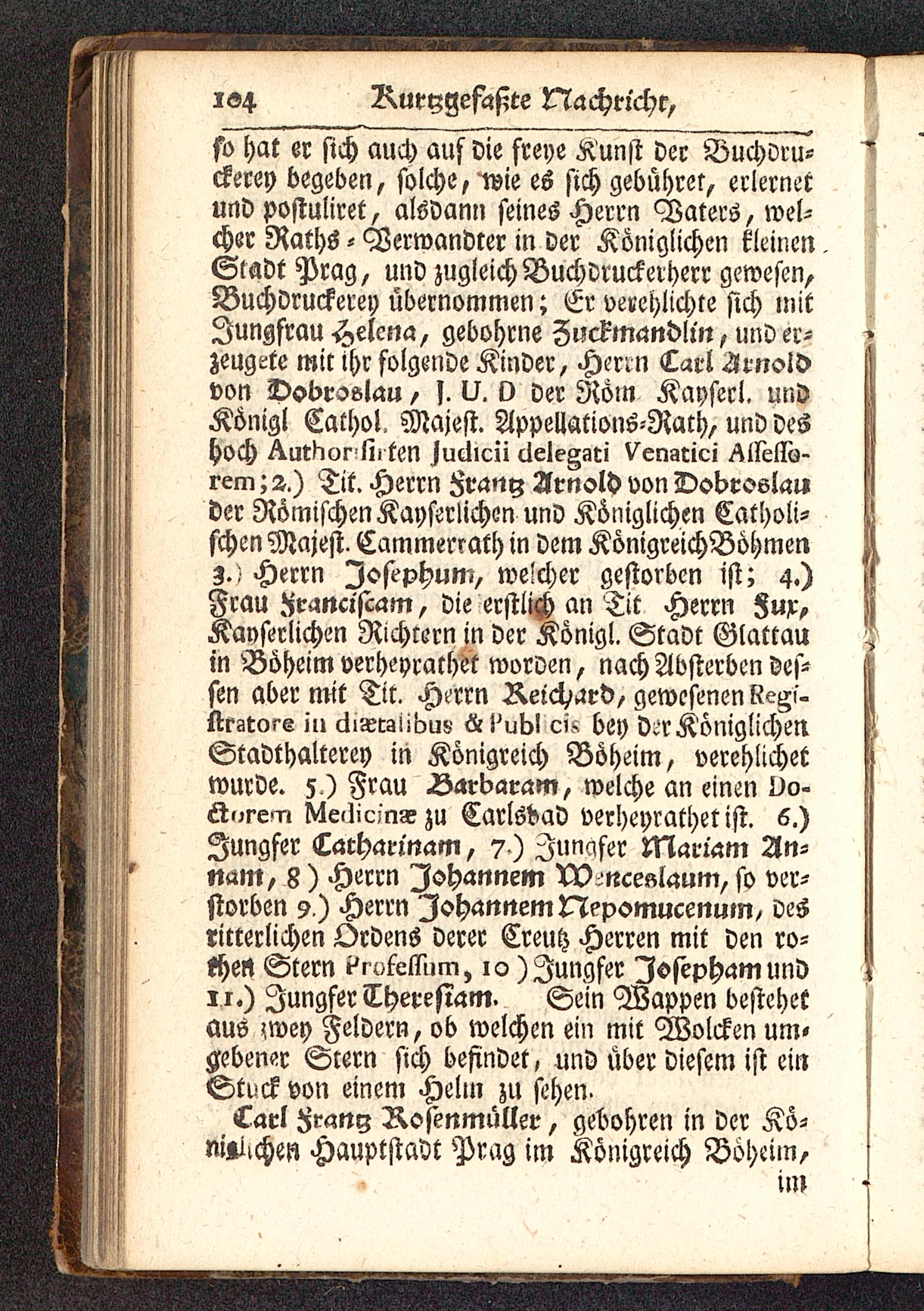 so hat er sich auch aus Die freye Kunst der Buchvru-ckerey begeben, solche, ilvie es sich gebührer, erlernetund postuliret, alsdann seines Herrn Vaters, wel-cher Raths - Verwandter in der Königlichen kleinenSladt Prag , und zugleich Buchdruckerherr gewesen,Buchdruckern) übernommen; Et vevehlichte sich mitJungfrau Helena, gebohrne Zuckmandlin, und er-zeugtte mit ihr folgende Kinder, Herrn Carl Ärnoldvon Dobroslau, ]. U. D der Rom Kaysecl. undKönig! Cathol. Majest. Appellations-Rath, und deshoch Authorsii ten juclicii delegati Venatici Assesso-rem Tit. Herrn Frany Arnold von Dobrosla»der Römischen Kayserlichen und Königlichen Catholi-schen Majest. Cammenath in dem KönigreichBöhmenz.) Herrn Joftphum, welcher gestorben ist; 4.)Frau .^ranciscam, die erstlich an Tit Herrn 8«x,Kanserlichen Richtern in der Königl. Stadt Glattauin Böheim verheyrathöt worden, nach Absterben des-sen aber mit Tir. Herrn Reichard, gewesenen Regf-stratore in diaetaiibus &\'ub\ eis bey d.r KöniglichenStadthalterey in Königreich Böheim, verehlichetwurde. 5 ) Frau Äarbaram, welche an einen L>o-ctorern Medicrnasju Carlsbad verheyrathet ist. 6.)Jungfer Catharinam, 7) Iunafer Mariam An-ti«m, 8) Herrn Ishannem XOmcedaum, so ver-storben 9 ) Herrn Iohannem Nepsmucenum/ desritterlichen Ordens derer Creutz Herren mit den ro-tfjert Stern Prosessum, 10) Jungfer Iosepham und11.) Jungfer Theresiam. Sein Wappen bestehetaus wey Feldern, ob welchen ein mit Wolcken um«Aebener Srern sich befindet, und über diesem ist einStuck von einem Helin zu sehen.