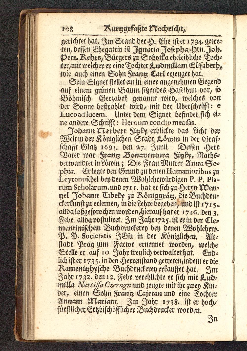 Johann lTlsrbere ^iyky erblickte das Licht derWelt in der Königlichen Sradt. kvwin in der Graf-schafft Glatz 169;. den 27. Junii Dessen HerrWater war 8rany 25onaventma Fiyky, Raths-verwandter in Löwin; Die Frau Mutter Anna So-phia. Er legte den Grund zu denen Hamanioribus ZULeytonuschel bey denen Wohlehrwürdigen P. H.rumScholarum,undi7if. hat er sich zu Herrn Ü?en-yel Jobantt Tlbety zu Röniggray, die Buchdru-ckerkunst zu erlernen, in die Lehre begeben, und ist 1715..alldaloßgesvrochenworden,hieraufhater »776. den z.Febr^ allda postuliret. Im Jahri725.jst erin der Cle-mcntt'nischen Buchoruckerey bey denen Wohlehrw.% P. Societatis JEsu in der Königlichen. Alt-stadt Prag zum Factor ernennet worden, welcheStelleer aus 10 Jahr treulich verwaltet hat. End-Zich ist er 173 5* in den Herrenstand getreten,indem er disRameniyhyfthe Buchdmckerey erkauftet hat. ImJahr 1732. den 12. Febr. verehlichte er sich mit L.ud-miKa Narcißi Czemgn und zeugte mit ihr zwey Kin-ser, einen Sohn $icm<$ Cajeran und eine TochterZnnam Mariam. Im Jahr 1738. ist er hoch>fürstlicher Ertzhischöfflicher Buchdrucker worden.