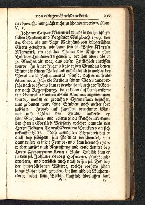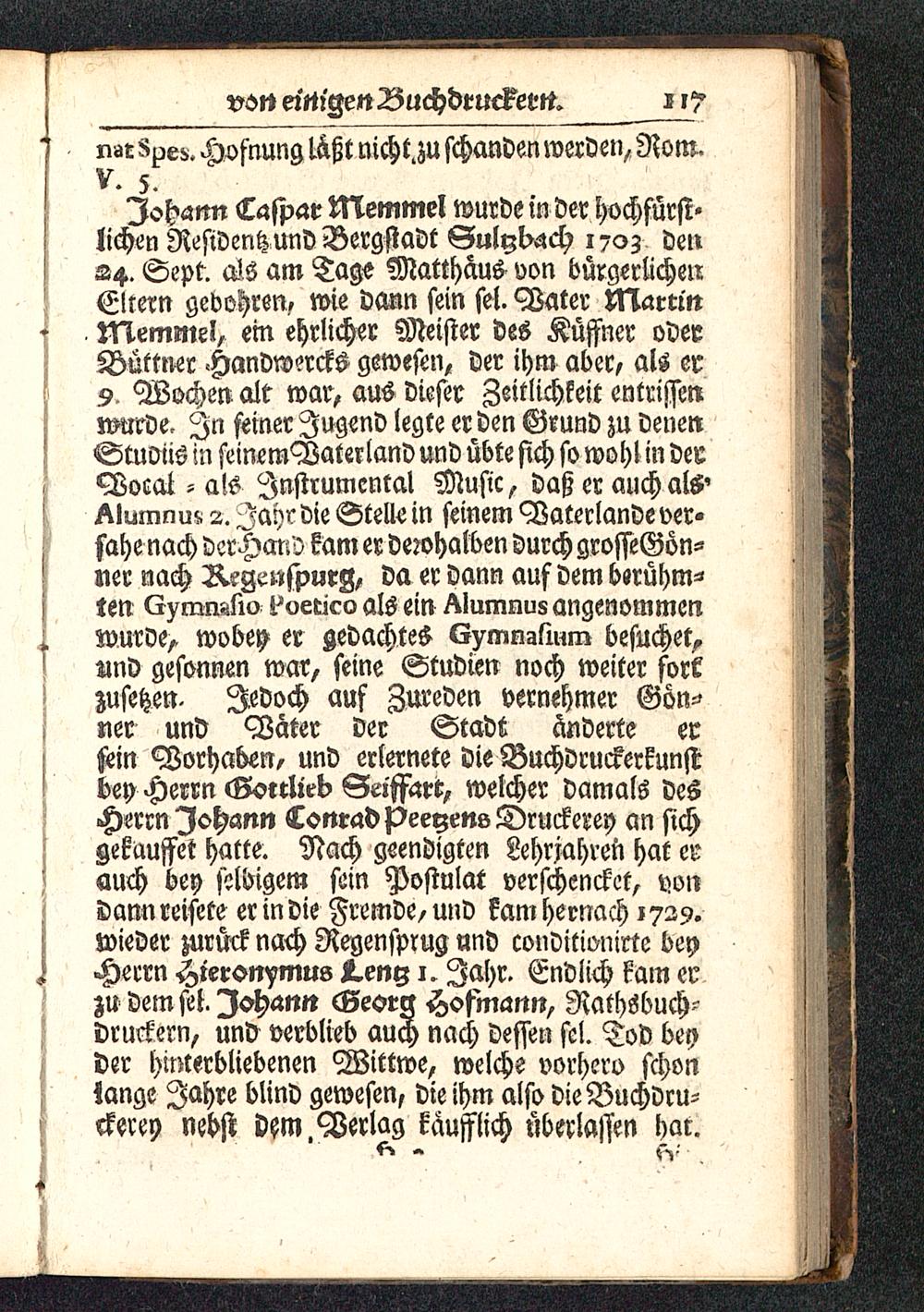 Johann Caspar Memmel wurde in der hochfürst«lichen Neswentz und Bergstadt Gulybach 170z den24. Sept. Äs am Tage Matthäus von bürgerlichemEltern gebohren, wie dann sein fei. Vater MartinZNemmel, ein ehrlicher Meister des Küffner oderBüttner HandwerckS gewesen, der ihm aber, als er9 Wochen alt war, aus dieser Zeitlichkeit entrissenwurde. In feiner Jugend legte er den Grund zu denenStuoiis in feinemVaterland und übte sich so wohl in derVocal - als Instrumental Music, daß er auch alS'Alumnus 2. Iaht die Stelle in seinem Vaterlande ver-sahe nach derHm-v kam er dewhalben durch grosseGön-ner nach R.?genfpurZ, da er dann auf dem berührn*ten Gymnasio Poetico als ein Alumnus angenommenwurde, wobey er gedachtes Gymnasium besuchet.And gesonnen war, seine Studien noch weiter forezusetzen. Jedoch auf Zureden vernehmer Gön--ner und Vater der Stadt änderte erfein Vorhaben, und erlernete die Buchdruckerkunstbey Herrn lSorrlieb Seiffart, welcher damals desHerrn Johann Conrad Peeyens Druckerey an sichgekuuffet hatte. Nach geendigten Lehrjahren hat erauch bey selbigem sein Postulat verschencket, vondannreisete er in die Fremde, und kam hernach 172?.wieder zurück nach Regensprug und conditionitte beyHerrn Hieronymus L.eny 1. Jahr. Endlich kam erzu dem sel. Johann Georg Hofmann, Rathsbuch.^druckern, und verblieb auch nach dessen sel. Tod beyder Hinterbliebenen Wittwe, welche vorhero schonlange Jahre blind gewesen, die ihm also die Buchdru-