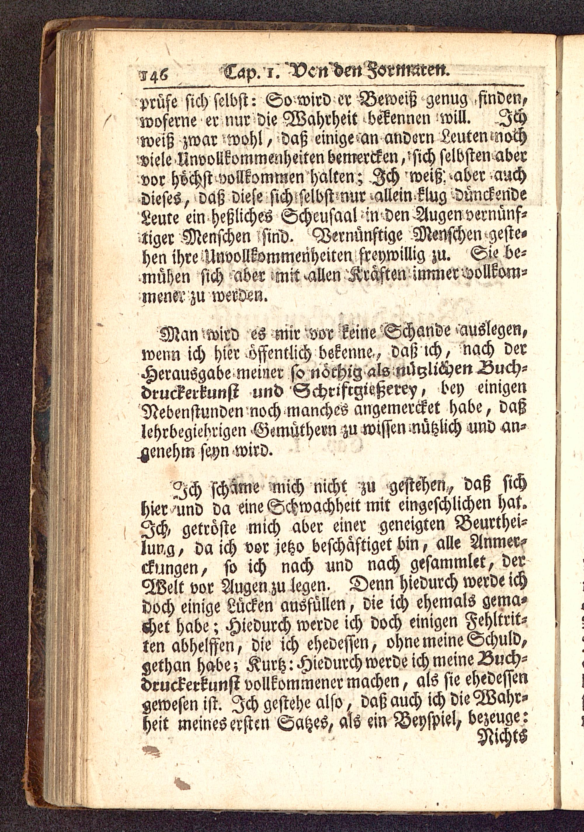 Ich schäme .mich nicht -zu gestchen^ daß sichhier ^und da eine Schwachheit mit eingeschlichen hat.Ich getroste mich aber einer geneigten Beurthei-Jung, da ich vor jetzo beschäftiget bin, alle Anmer-ckungen/ so ich nach und nach gesammlet, derWelt vor Augen zu legen. Denn hiedurch werde ichdoch einige Lücken ausfüllen, die ich ehemals gema-chet habe; Hiedurch werde ich doch einigen Fehltrit-ten abhelffen, die ich ehedessen, ohne meine Schuld,Zethan habe; Kurtz: Hiedurch werde ich meine Such-druckerßunst vollkommener machen, als sie ehedessenzewesen ist. Ich gestehe also, daß auch ich die Wahr-heit meines ersten Satzes, als ein Beyspiel, bezeuge :^ Nichts