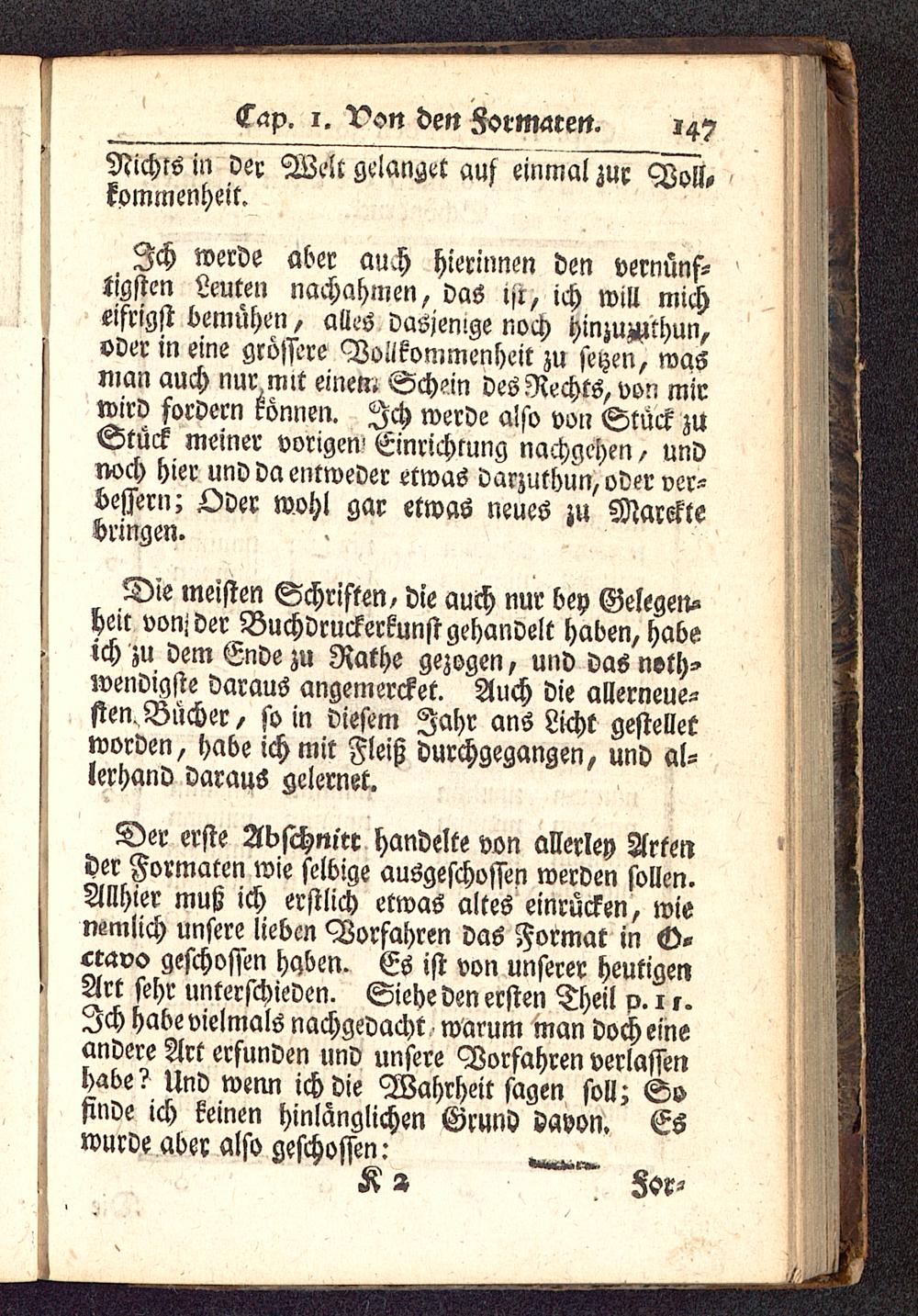 Der erste Abschnitt handelte von allerley Artender Formaten wie selbige ausgeschossen werden sollen.Allhier muß ich erstlich etwas altes einrücken, wiensmiich unsere lieben Vorfahren das Format in <D*ceavo geschossen haben. Es ist von unserer heutigenArt sehr unterschieden. Siehe den ersten Theil p.n.Ich habe vielmals nachgedacht warum man doch eineandere Art erfunden und unsere Vorfahren verlassenhabe? Und wenn ich die Wahrheit sagen soll; Sofinde ich keinen hinlänglichen Grund davon. Eswurde aber also geschossen: