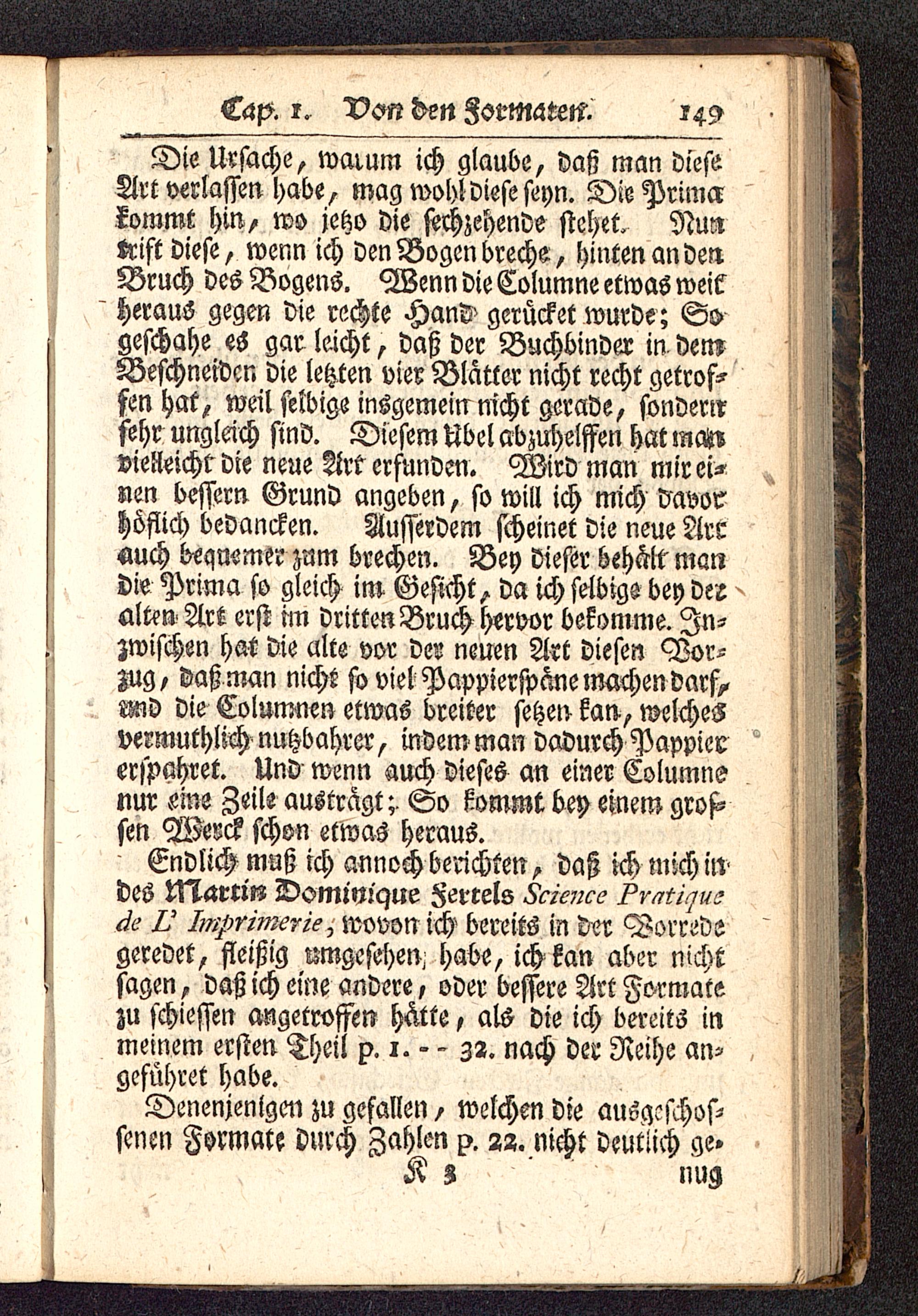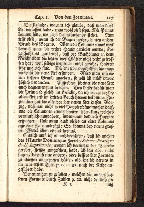 Endlich muß ich annoch berichten, daß ich mich iwdes Vslattm Domwique Ferrels Science Pvatiquzde ü Imprimerie, wovon ich bereits in der Vorredsgeredet, fleißig umgesehen, habe, ich kan aber nichtsagen, daß ich eine andere, oder bessere Art Formatezu schiessen angetroffen hätte, als die ich bereits inmeinem ersten Theil p. i. - - 32. nach der Reihe an-geführet habe.