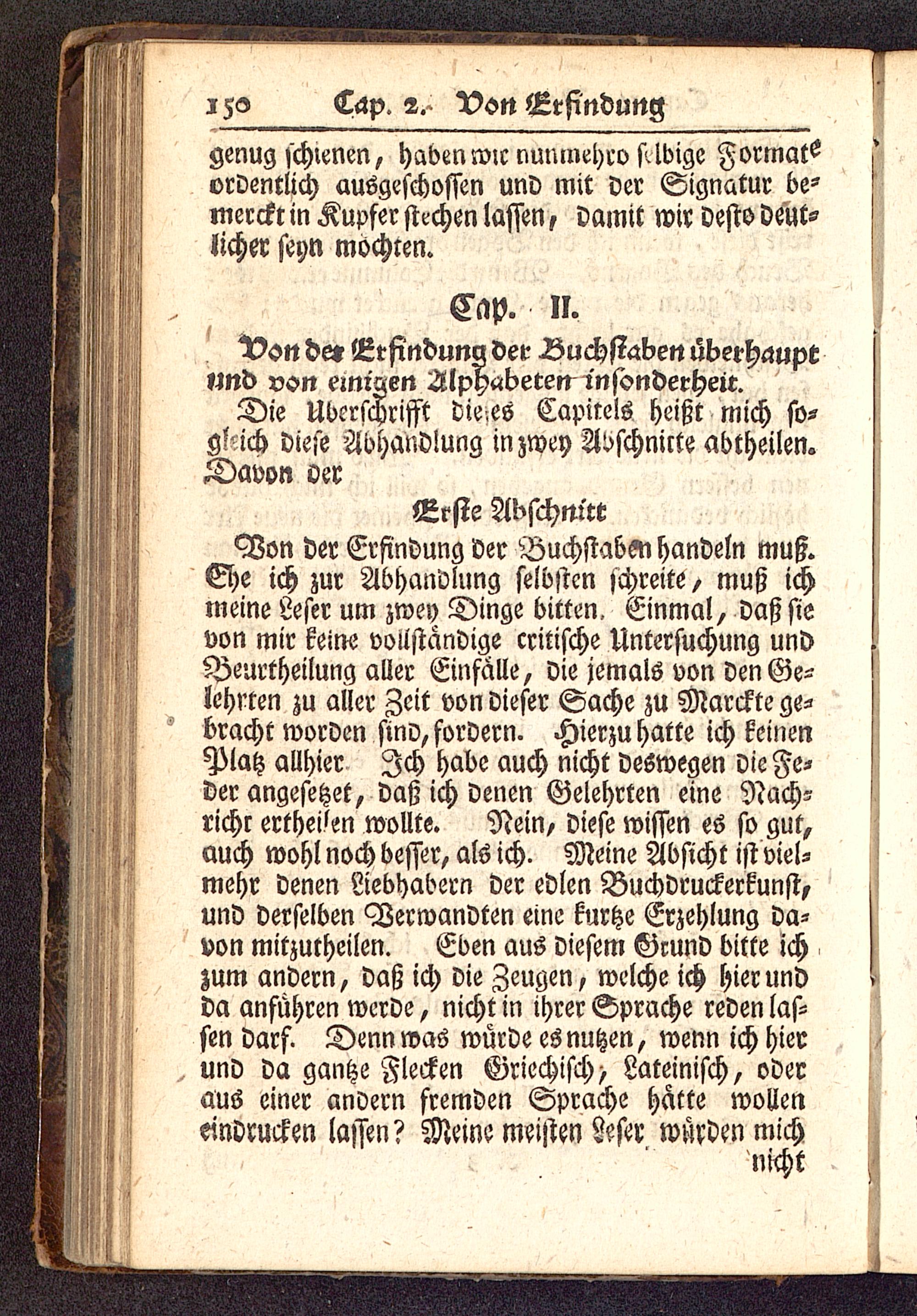 Von der Erfindung ver Buchstabm handeln muß.G)e ich zur Abhandlung selbsten schreite/ muß ichmeine Leser um zwey Dinge bitten. Einmal, daß sievon mir him vollständige critische Untersuchung undBeurtheilung aller Einfalle, die jemals von den Ge-lehrten zu aller Zeit von dieser Sache zu Marckte ge-bracht worden sino, fordern. Hierzu hatte ich keinenPlatz allhier Ich habe auch nicht deswegen die Fe-der angesetzet, daß ich denen Gelehrten eine Nach-richr ertheilen wollte. Nein, diese wissen es so gut,auch wohl noch besser, als ich. Meine Absicht ist viel-mehr denen Liebhabern der edlen Buchdruckerkunst,und derselben Verwandten eine kurtze Erzehlung da-von mitzutheilen. Eben aus diesem Grund bitte ichzum andern, daß ich die Zeugen, welche ich hierundda anführen werde, nicht in ihrer Sprache reden las-sen darf. Denn was würde es nutzen, wenn ich hierund da gantze Flecken Griechisch > Lateinisch, oderaus einer anvern fremden Sprache hatte wolleneindrucken lassen? Meine meisten Aftr würden mich