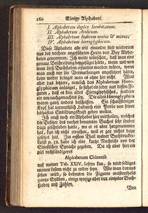 Ich muß noch ein Alphabet hier mittheilen, weichesder Besitzer des vorher benamten Buches sehr sauberdazu geschrieben hatte, wo er es aber hergenommenhat, ran ich nicht errathen, weil er gar nichts dazugesetzet hat. In» ersten Theil meiner Buchdrucker-kunst p. 52. habe ich eins, kurtze Nachricht von derSinesischen Sprache gegeben. Da ich aber hiereinW\ vollständigeres