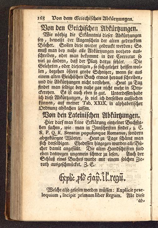 Wie nöthig die Erkänntnis dieser Adkürtzungensey, beweißt oer Augenschein der alten gedrucktenBücher. Sollen diese wieoer gedruckt werden; So.muß man bey nahe alle Adkürtzungen vorhero aus-schreiben, oder man bekommt in der Correctur soviel zu andern, daß der Platz darzu fehlet. • DieGelehrten, oder diejenigen, so sich gelehrt heissen wol-len, begehen öfters grobe Schnitzer, wenn sie auseinem alten Grichischen Buch etwas heraus schreiben,und die Adkürtzungen nicht verstehen. Heut zu Tagfindet man selbige bey nahe gar nicht mehr in Dru-ckereyen. Es ist auch eben so gut. Unterdessen habeich diese Adkürtzungen, so viel ich derselben aufsuchenkönnen, auf meiner Tab. XXIX. in alphabetischerOrdnung abstechen lassen.