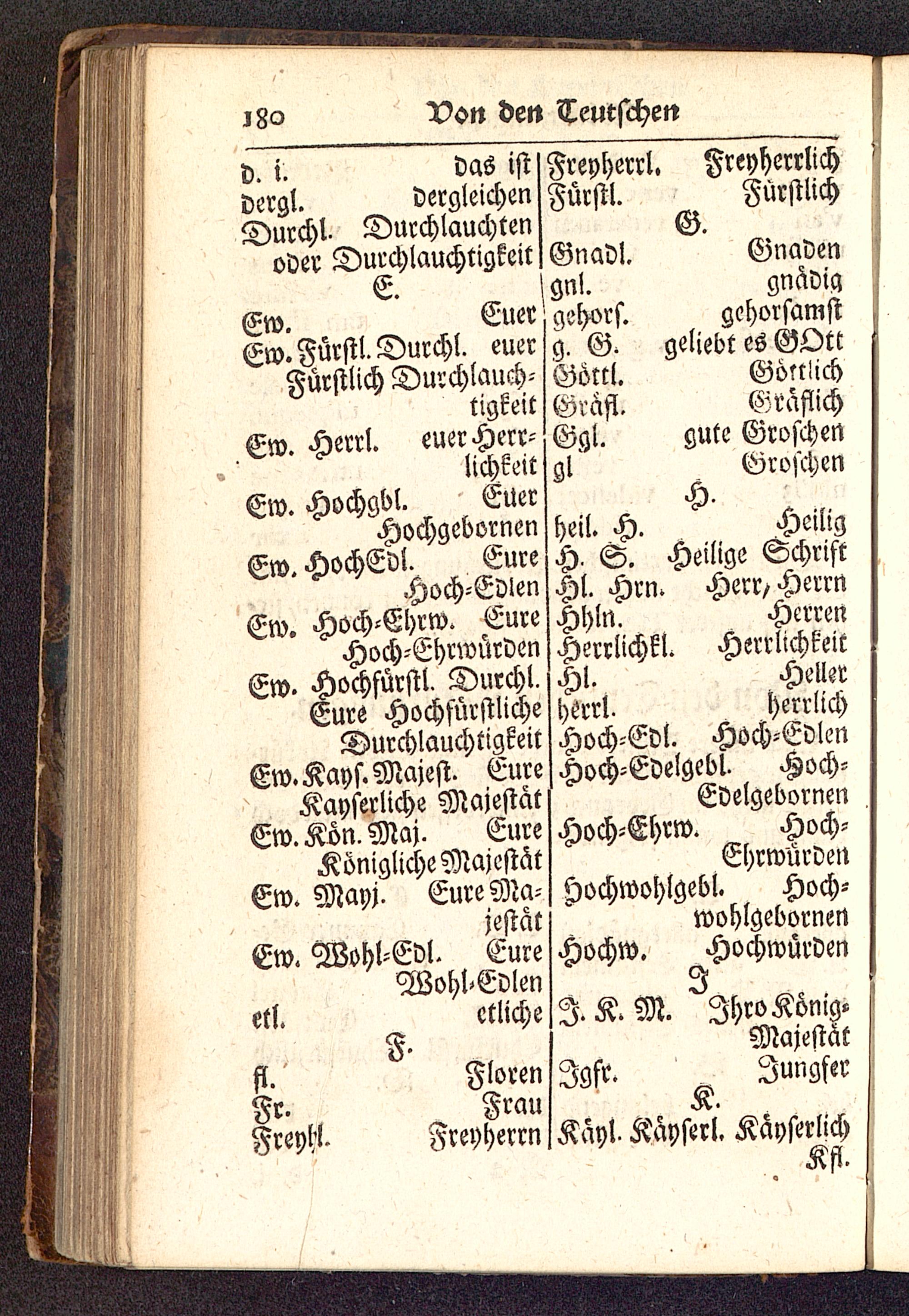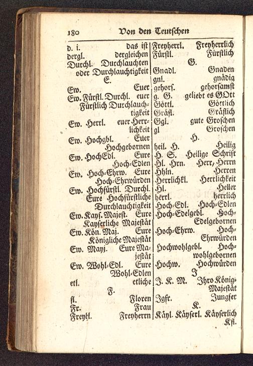 Ew. Hochgbl. EuerHochgebornenEw. HochEdl. EureHoch-EdlenEw. Hoch-Ehrw. EureHoch-EhrwürdenEw. Hochfürstl. Durchl.Eure HochfürstlicheDurchlauchtigstEw.Kays.Majest. EureKayserliche MajestätEw.Kön.Maj. EureKönigliche MajestätEw. Mayj. Eure Ma-jestät