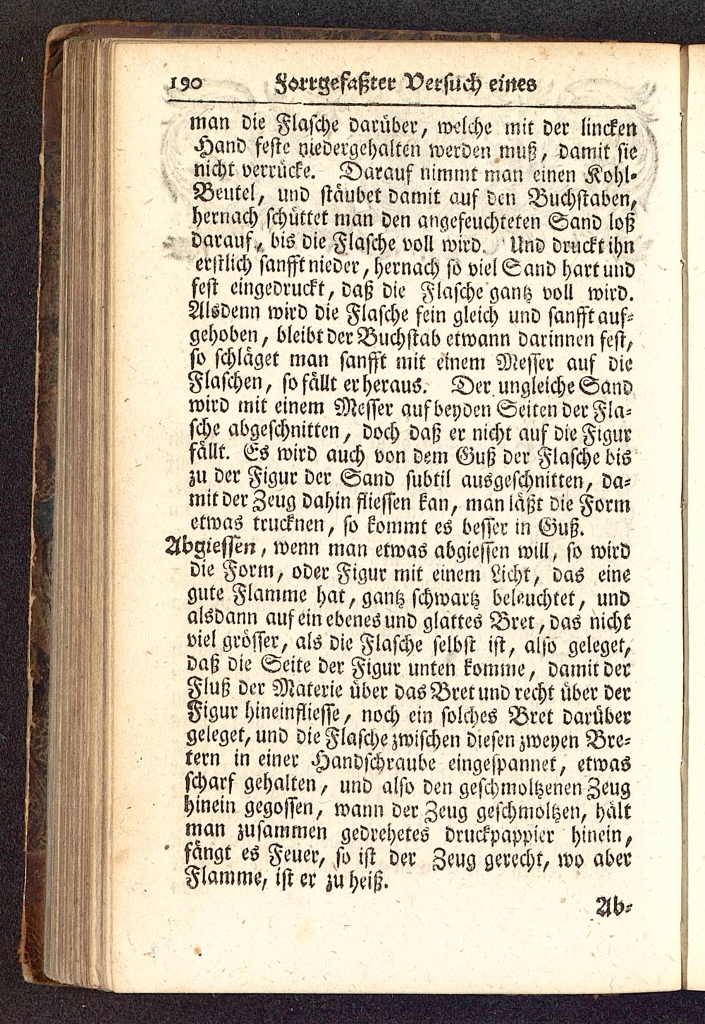 Abgießen, wenn man etwas abgiejjen will, so wirddie Form, oder Figur mit einem Licht, das einegute Flamme hat, gantz schwartz beleuchtet, undalsdann auf ein ebenes und glattes Brer,das nichtviel grösser, als die Flasche selbst ist, also geleget,daß die Seite der Figur unten komme, damit derFluß der Materie über das Bret und recht über derFigur hineinfliesse, noch ein solches Bret darübergeleget, und die Flasche zwischen diesen zweyen Bre-tern in einer Hanvschraube eingespannet, etwasscharf gehalten, und also den geschmoitzenen Zeughinein gegossen, wann der Zeug geschmoltzen, haltman zusammen gedrehetes drnckpappier hinein,