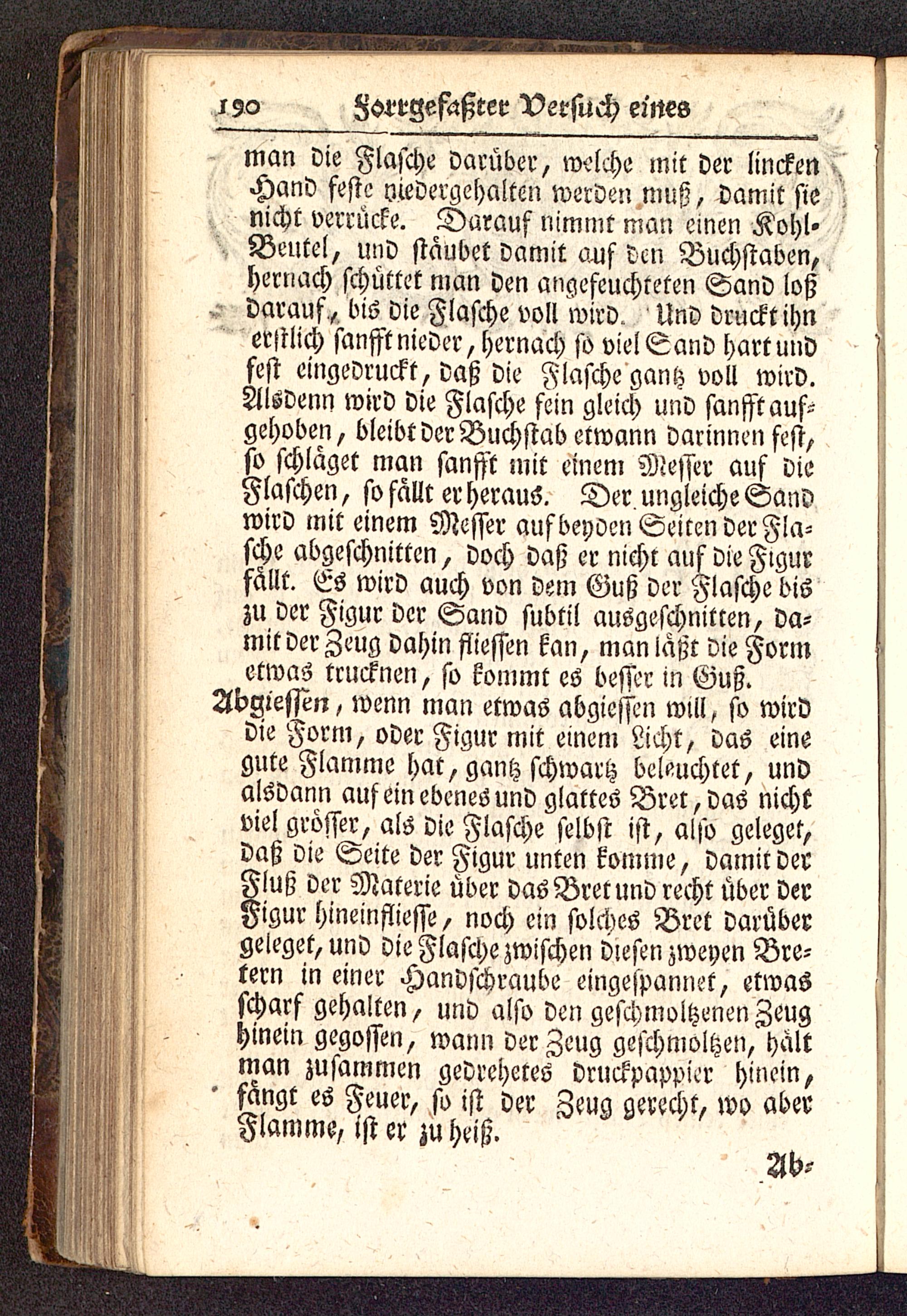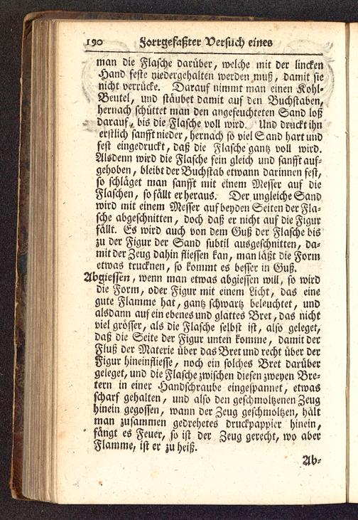 man die Flasche darüber, welche init der linckenHand feste niedergehalten werden muß, Damit sienicht verrücke. Darauf nimmt man einen Kohl-Beutel, und staubet damit auf den Buchstaben,hernach schüttet man den angefeuchteten Sand loßdarauf, bis die Flasche voll wird. Und druckt ihnerstlich sanfftnieder, hernach so viel Sand hartundfest eingedruckt, daß die Flasche gantz voll wird.Alsdenn wird die Flasche fein gleich und sanfftauftgehoben, bleibt der Buchstab etwann darinnen fest,so schlaget man sanfft init einen, Messer auf dieFlaschen, so fallt er heraus. Der. ungleiche Sandwird mit einem Messer aufbeyoen SeitenderFIa-sche abgeschnitten, doch daß er nicht auf die Figurfällt. Es wird auch von dem Guß der Flasche biszu der Figur der Sand subtil ausgeschnitten, da-mit der Zeug dahin Dessen kan, man läßt die Formetwas trucknen, so kommt es besser in Guß.
