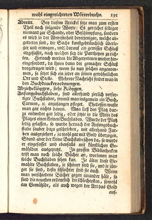 Anfangsbuchstaben, sind allerhand zierlich verfer-tigte Buchstaben, womit man insgemein ein Buch,Carmen, ?c. anzufangen pfleget. Ehedessen wüsteman gar nichts davon. Man ließ den Platz dar-zu entweder gar ledig, oder setzte in die Mitte desPlatzes einen kleinenBuchstaben. Wurde der Platzledig gelassen, so wurde hernach der Anfangsbuch-siabe sauber dazu geschrieben, mit allerhand Far-den ausgeziehret, ja wohl gar mit Gold überzogen.Stund aber der kleine Buchstabe schon da/ so wurdeer eingefasset und ebenfalls mit künstlichen Ge-mählden ausgeputzt. In grossen Bibliotheckentrift man noch solche Bücher an, worinnen mansolche Buchstaben sehen kan. Je alter diese Ge-mahlte Buchstaben, je schöner sind sie, undje jün-ger sie sind, desto schlechter sind sie auch. Wennman verschiedene Bücher gegen einander hält, sosind die neuesten ordentlich die schlechtesten, sowohlam Gemählde, als auch wegen der Art das Gold